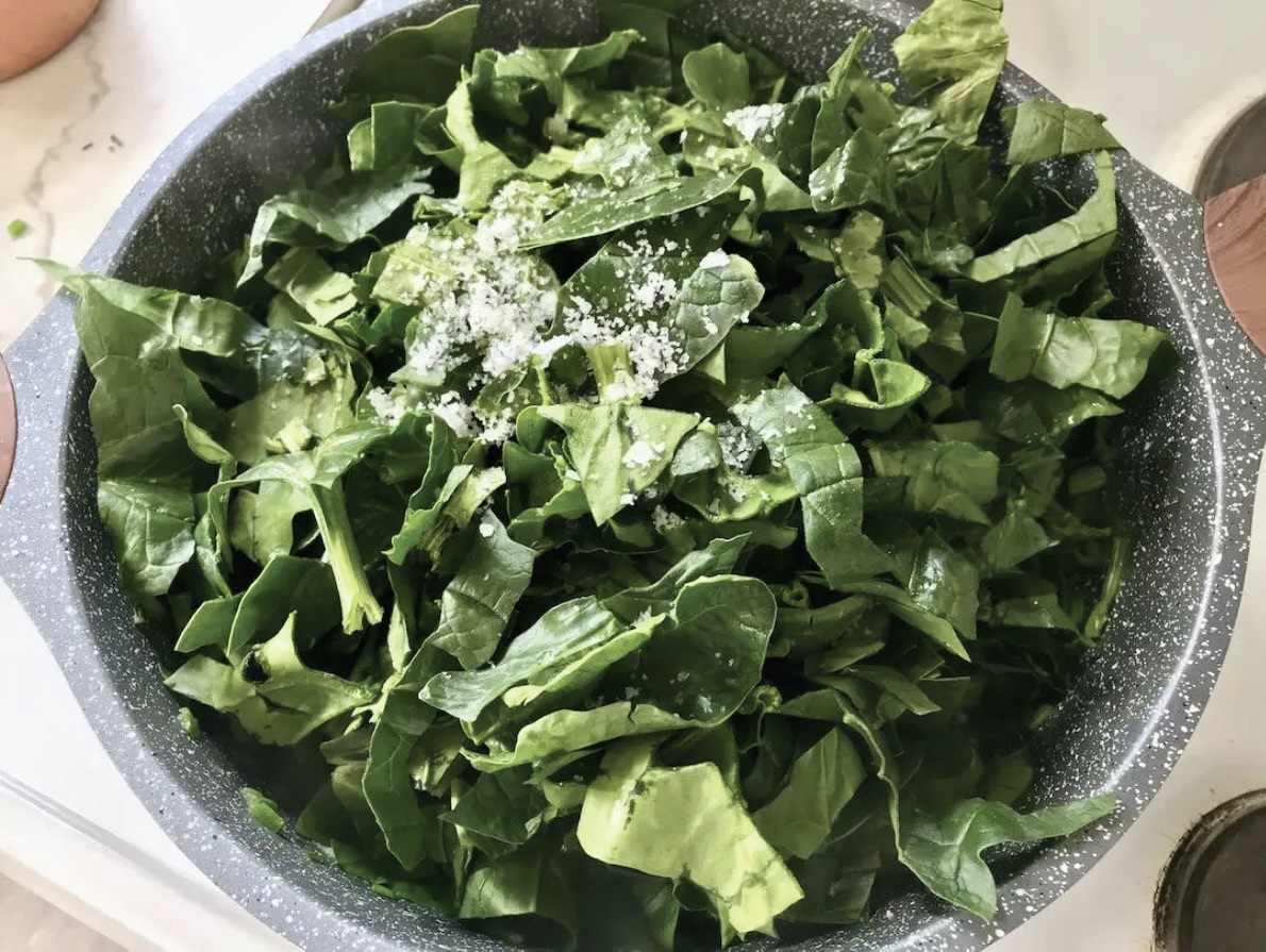Smażenie II: Następnie wrzuć na patelnię posiekane liście szpinaku. Dodaj sól, przykryj patelnię pokrywą i duś warzywa chwilę, aż liście szpinaku „zwiędną”.
