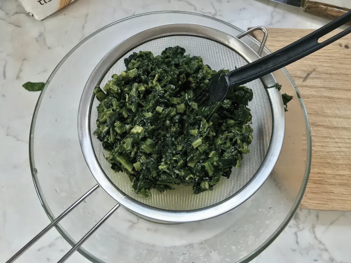 Odsączanie: Przesmażone warzywa przełóż na sito i pozostaw do odcieknięcia. Raz na czas ugnieć warzywa, aby wyciekło z nich jak najwięcej płynu. Ważne: warzywa powinny być jak najlepiej odciśnięte, aby farsz nie był zbyt wodnisty.
