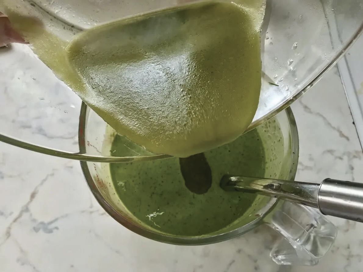 Ciasto: Umieść wszystkie składniki na ciasto w misce malaksera i wrzuć do nich garść liści szpinaku. Zmiksuj wszystko i odstaw ciasto na 30 minut, aby odpoczęło (dowiedz się, jak przygotować idealne ciasto na naleśniki).