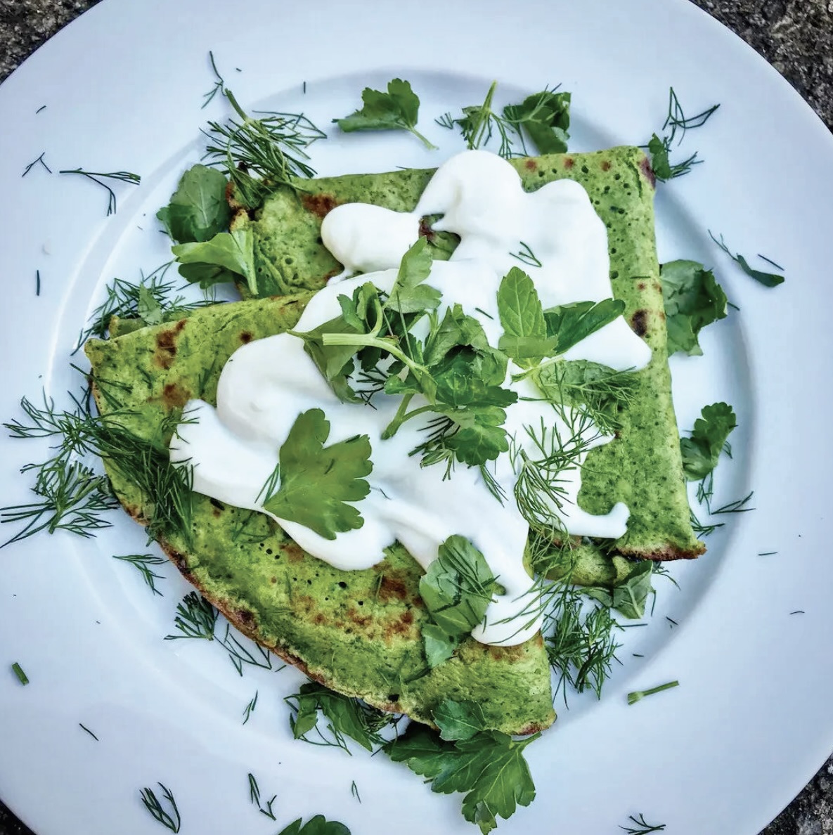 Podanie: Podawaj od razu lub podgrzane na patelni. Naleśniki tuż przed podaniem możesz okrasić kleksem gęstego jogurtu greckiego i posypać posiekanymi ziołami, których użyłeś do farszu.