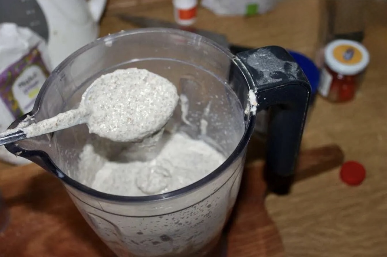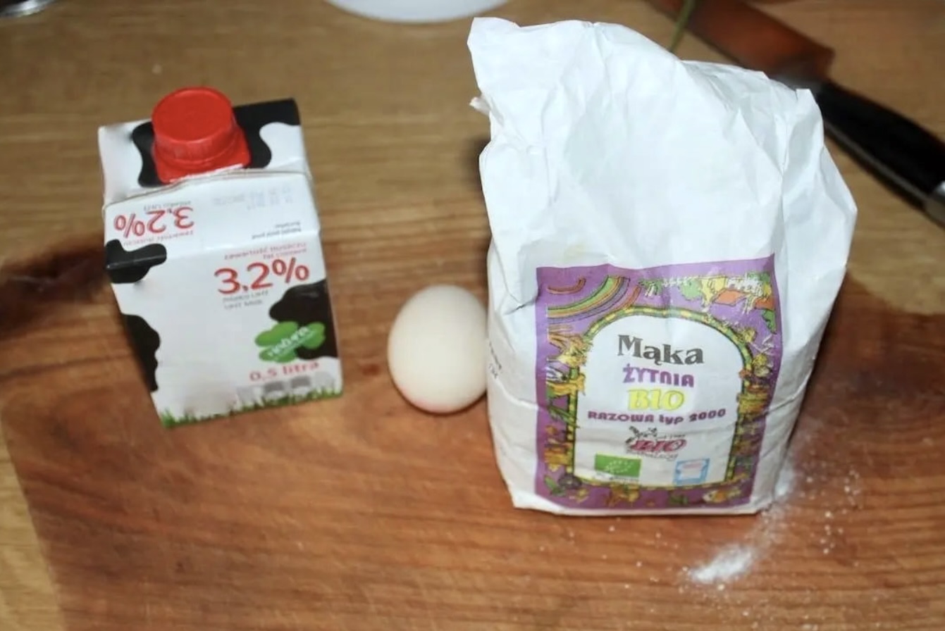 Do miski (najlepiej malaksera) wsyp mąkę żytnią razową, wbij jajko, wlej mleko i dodaj szczyptę soli.