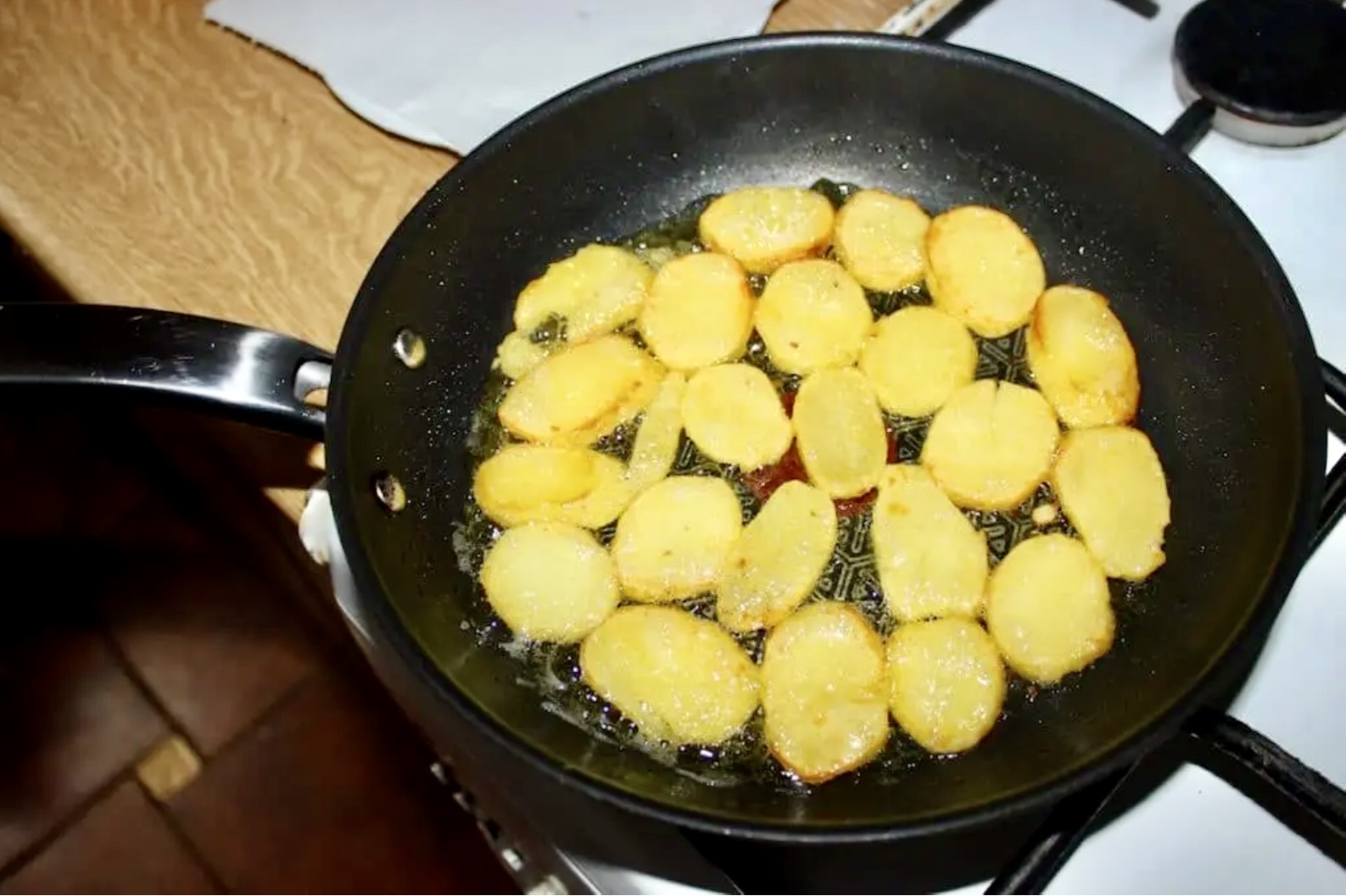 Na patelni rozgrzej oliwę i masło, a następnie obsmaż „na złoto” pokrojone ziemniaki. Przełóż je na ręcznik papierowy.