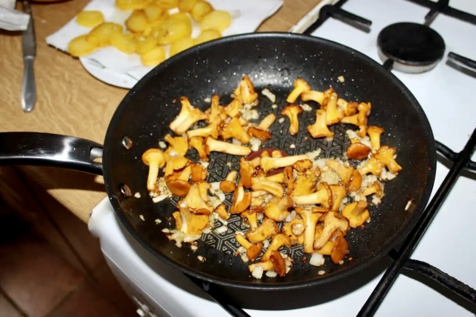 Przygotowanie kurek i warzyw: Kurki oczyść pędzelkiem (poznaj grzyby kurki właściwości zdrowotne). Ziemniaki pokrój na plasterki. Cebulę obierz i pokrój w drobną kostkę. Posiekaj niewielką ilość dymki lub szczypiorku.