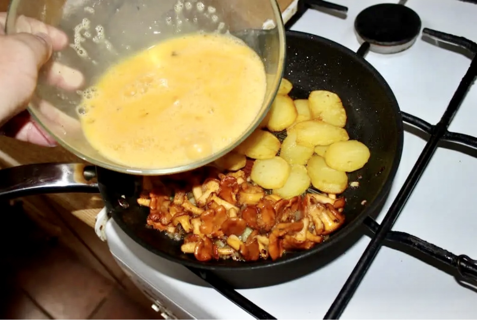 Zdejmij patelnię z gazu i poruszając nią dookoła (oraz używając mieszadła) połącz składniki, tak aby masa jajeczna „oblała” spód patelni. Upewnij się, że grzyby lub ziemniaki nie przylegają do dna, aby się nie przypaliły.