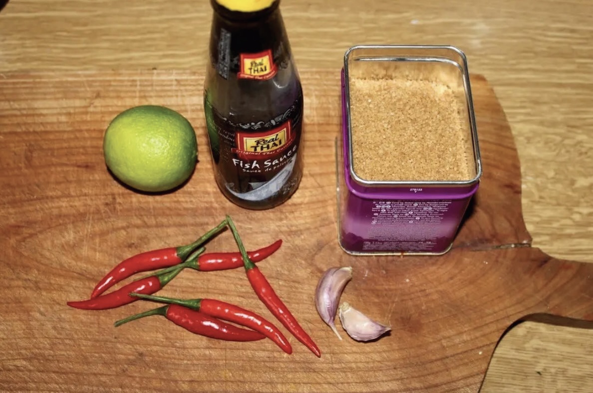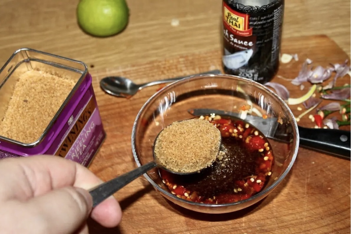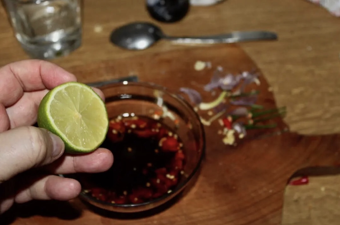 Łączenie składników: Przełóż utartą masę do miseczki. Dodaj sos rybny, cukier oraz wodę (woda złagodzi słony smak sosu rybnego). Na koniec wyciśnij sok z całej limonki.