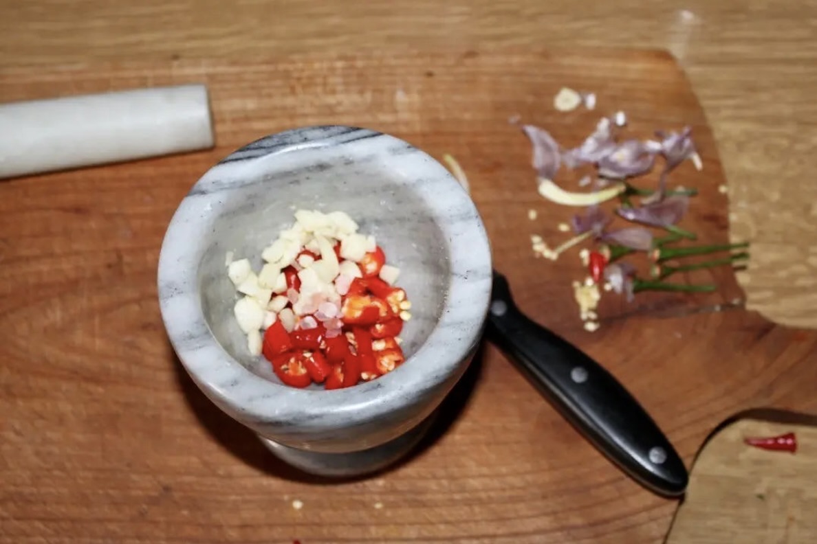 Przygotowanie bazy: Papryczki chilli posiekaj drobno (z pestkami dla większej ostrości). Włóż je do moździerza razem z obranymi ząbkami czosnku.