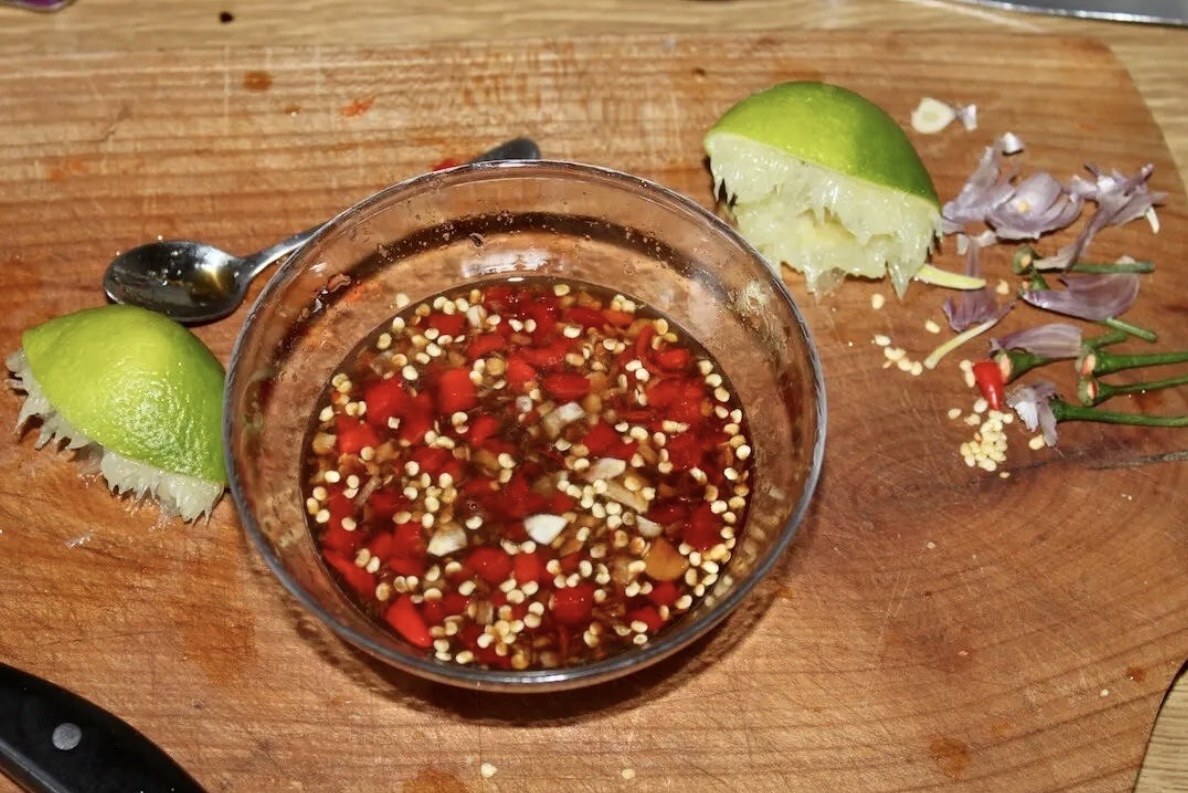 Nuoc cham (czytaj nok czam) to bodaj jeden z najpopularniejszych sosów w Wietnamie. Banalny do przygotowania, niebanalny w smaku. Przygotowanie go wymaga niewielkiego nakładu pracy i czasu, efekty zaś są piorunujące. Jego istotą jest połączenie smaków ostrego, słonego, słodkiego i kwaśnego. No i doprawienie oczywiście dość kontrowersyjnym i charakterystycznym w smaku sosem rybnym. W zasadzie smak sosu powinien być zrównoważony (jak to w potrawach azjatyckich), ale jednak w tym przypadku nuoc cham powinien być naprawdę ostry. Tak przygotowany sos to świetny sos do sajgonek.