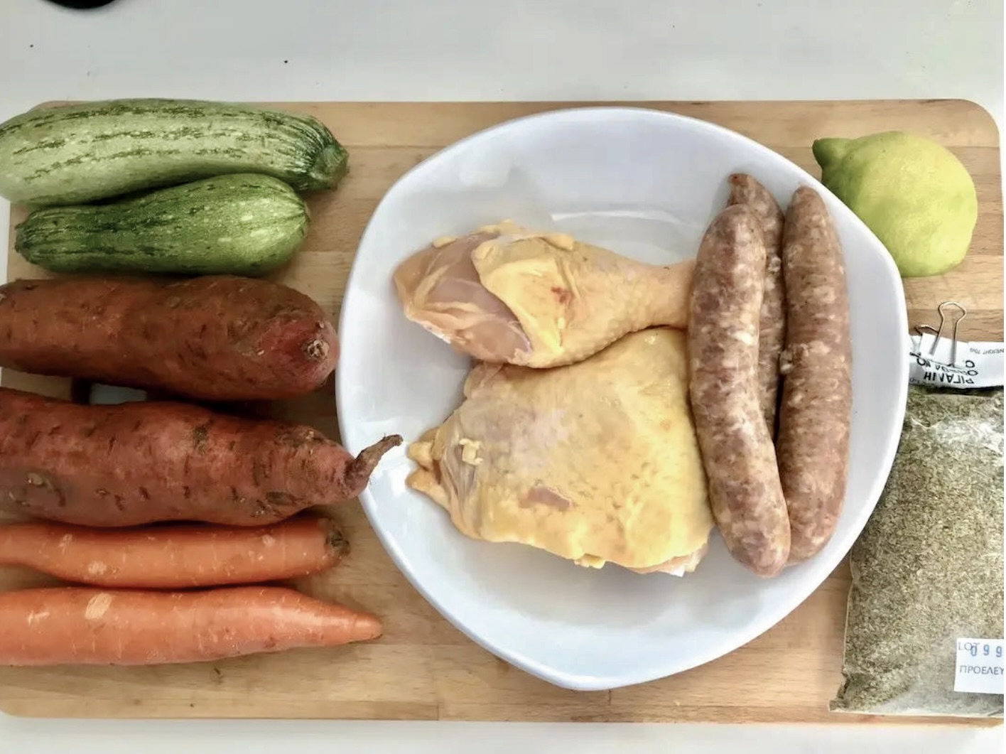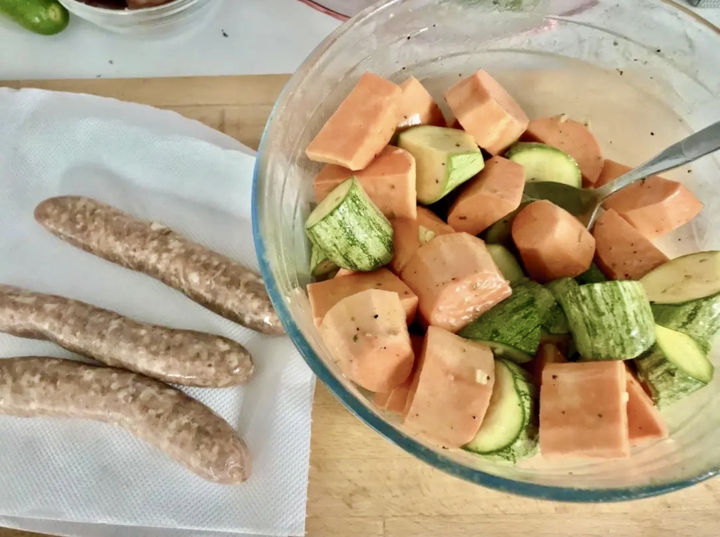 Przygotowanie warzyw i kiełbasek: W międzyczasie obierz bataty i pokrój je w duże kawałki, podobnie pokrój cukinie. Pokrojone warzywa obtocz w pozostałej marynacie (tej, którą pokryty jest kurczak). Przygotuj surowe kiełbaski.