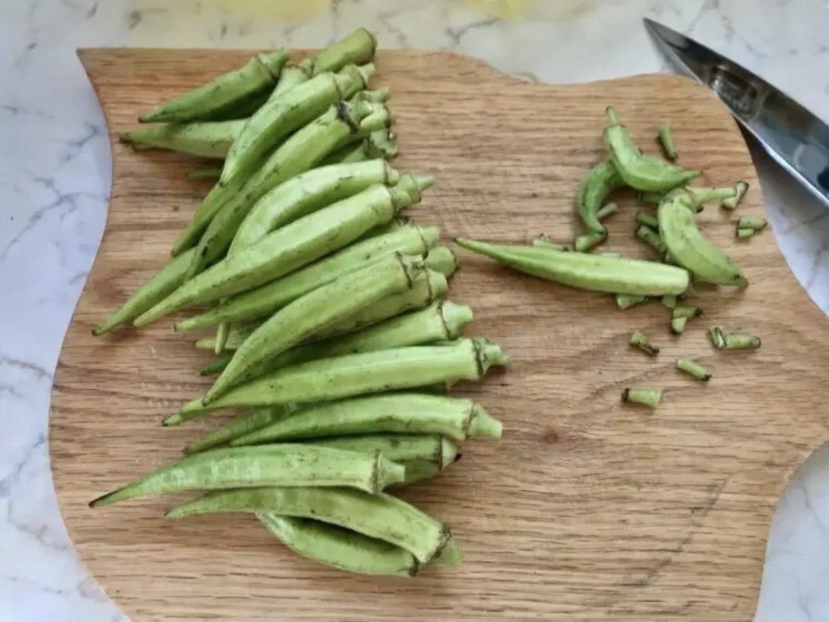Przygotowanie okry: Świeżą okrę umyj i osusz. Odetnij twarde końcówki (ogonki), uważając, aby nie przeciąć samej komory z nasionami (to zapobiega nadmiernemu wydzielaniu soku). Skrop okrę octem winnym, a następnie odstaw na 15-20 minut – ten trik sprawi, że warzywo zachowa lepszą strukturę.