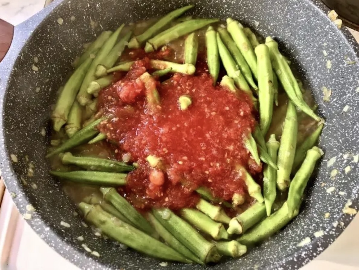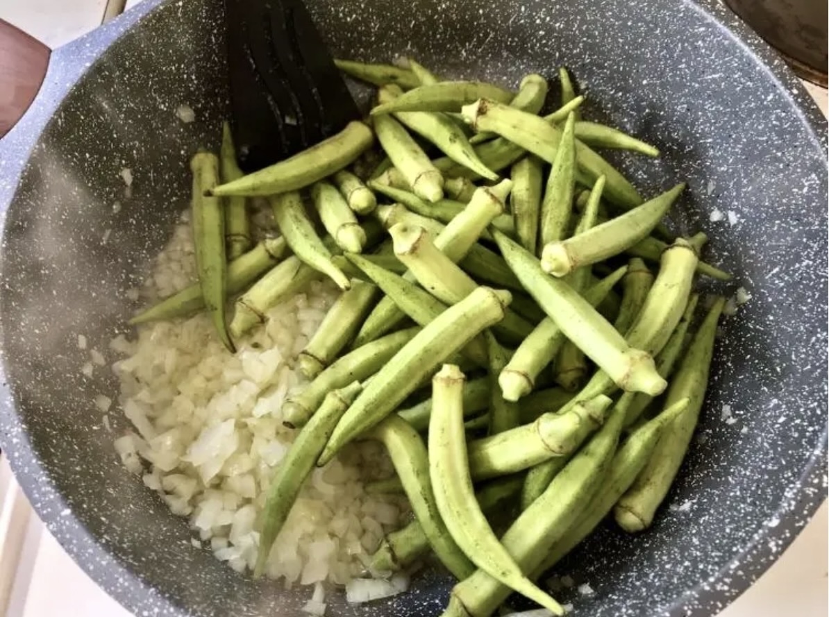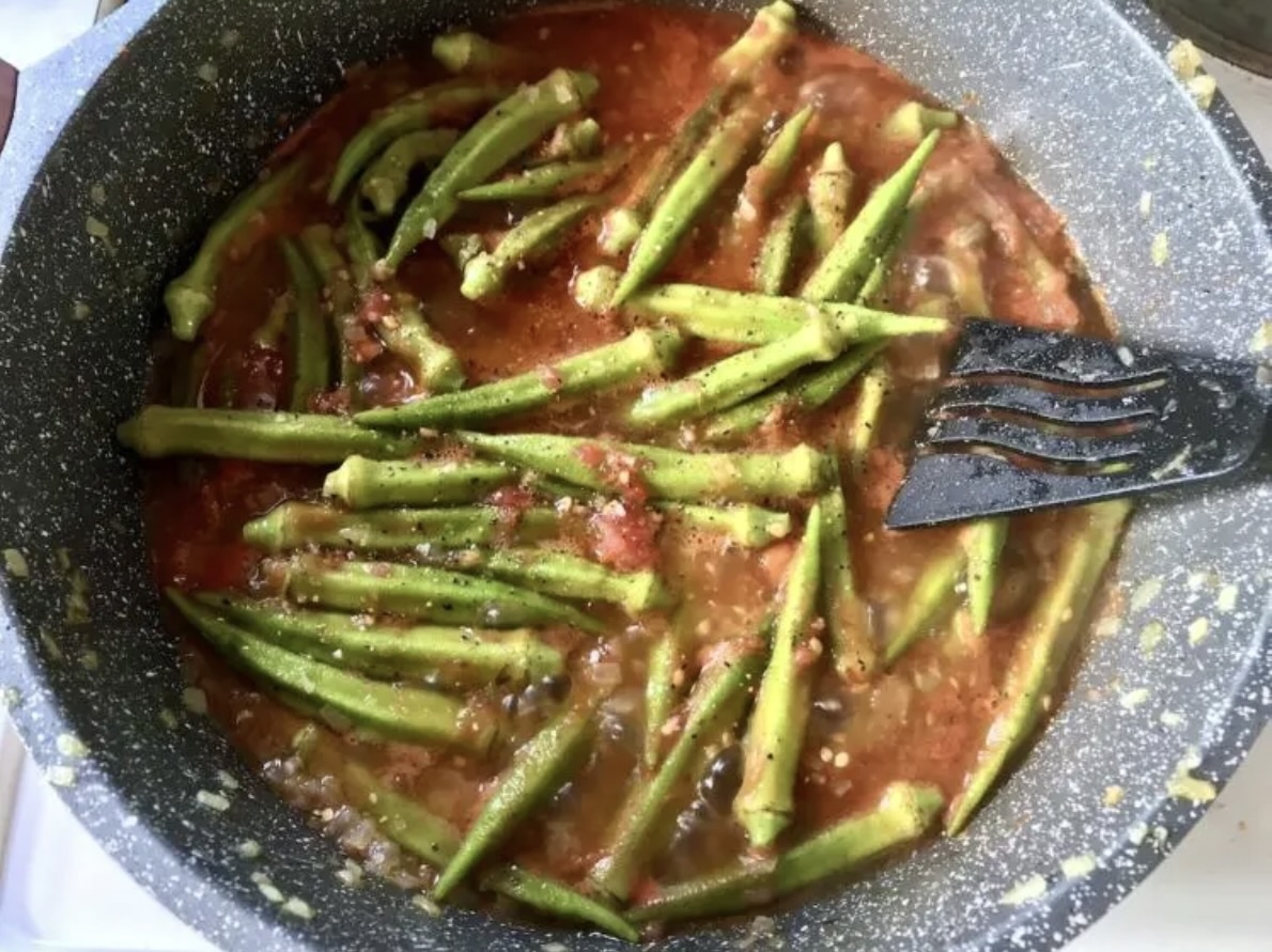 Duszenie: Do sosu dodaj przygotowaną wcześniej okrę. Gotuj na małym ogniu pod przykryciem przez około 15 minut.