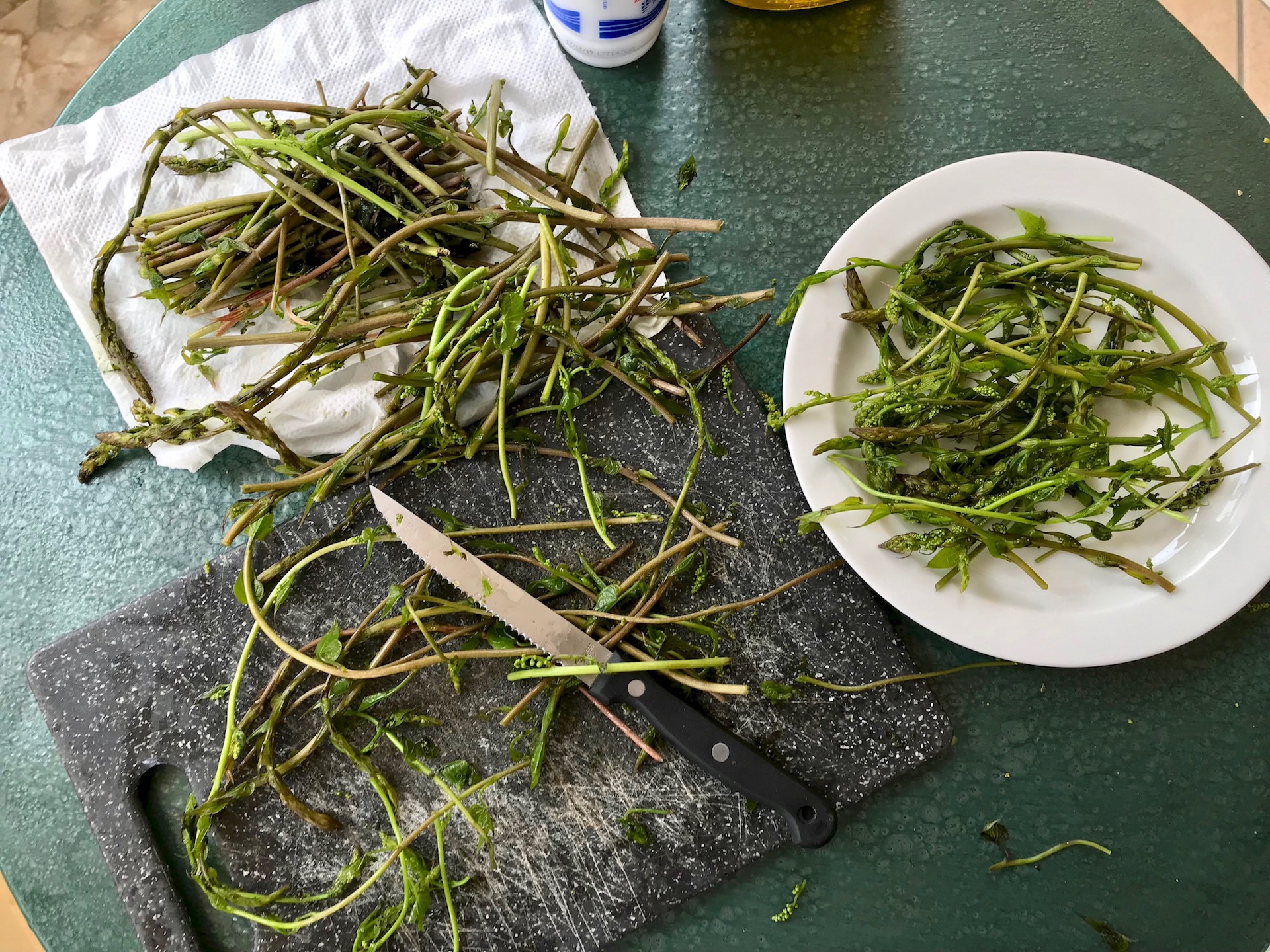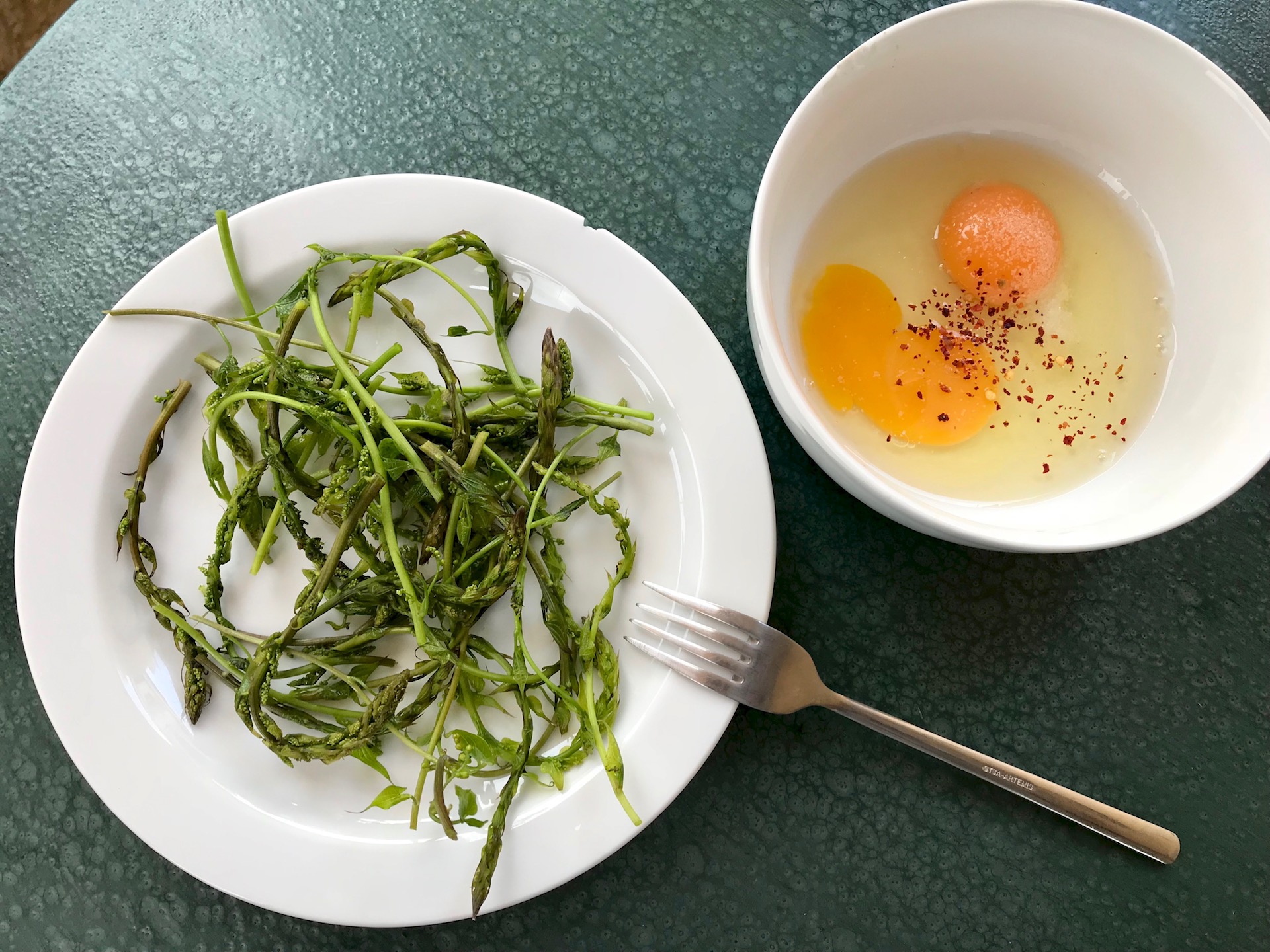 Przygotowanie szparagów: Odetnij zdrewniałe końcówki dzikich szparagów i oczyść je z wszelkich nieczystości. Umyj i odsącz z wody.
