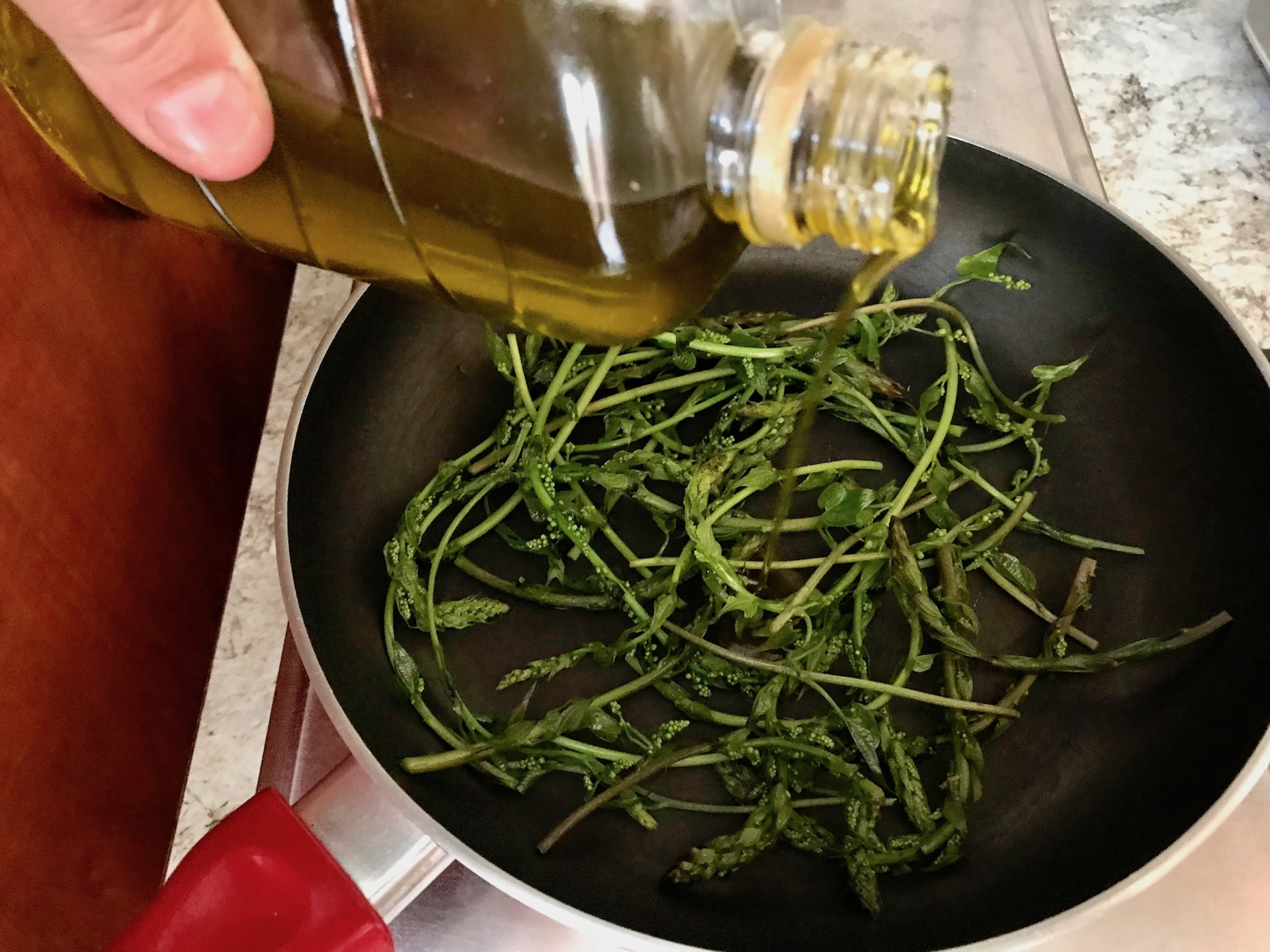 Smażenie szparagów: Szparagi wrzuć na średnio rozgrzaną patelnię. Jeśli są twardsze elementy, wlej odrobinę gorącej wody i podduś szparagi przez 3 minuty, aż zmiękną, a woda odparuje. Następnie wlej 3 łyżki oliwy. Smaż szparagi na średnim ogniu przez 1 do 2 minut (w zależności od grubości).