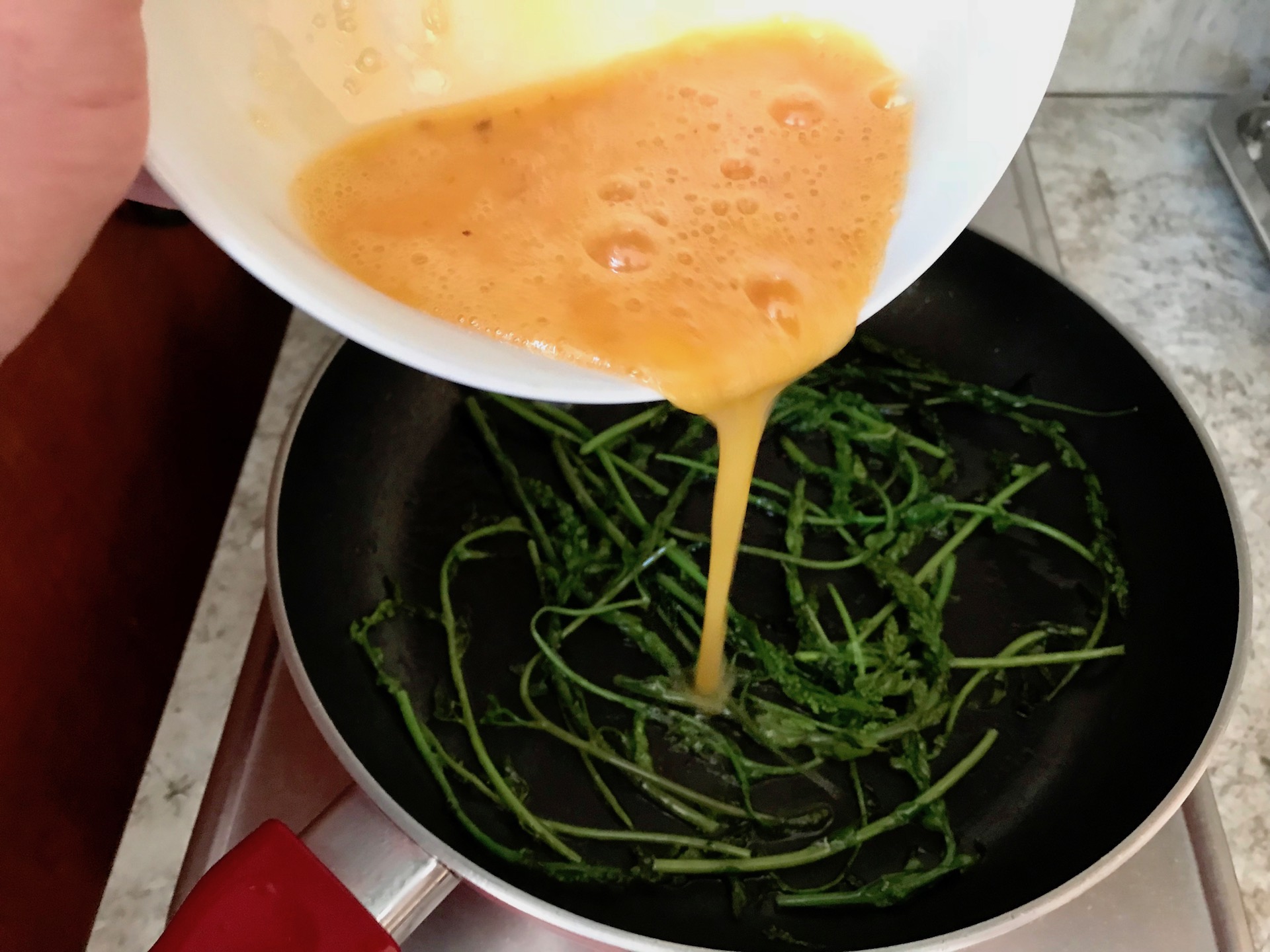 Przygotowanie omleta: Do krótko przesmażonych dzikich szparagów wlej masę jajeczną. Ogień pod patelnią powinien pozostać na średnim poziomie. Rozlej masę jajeczną po patelni kolistym ruchem, aby pokryła wszystkie szparagi. Smaż omleta powoli.