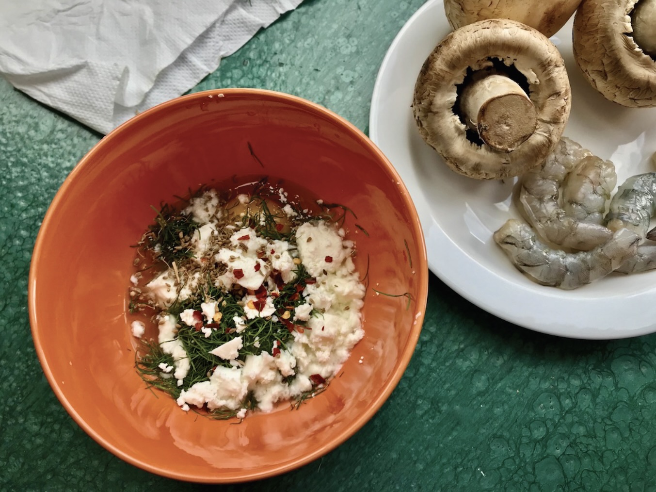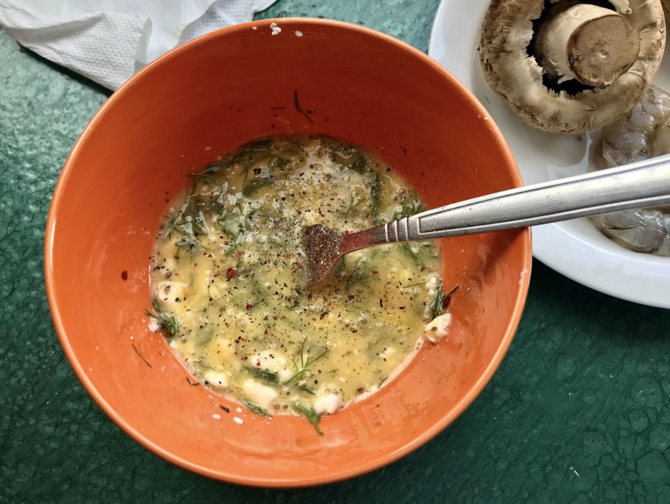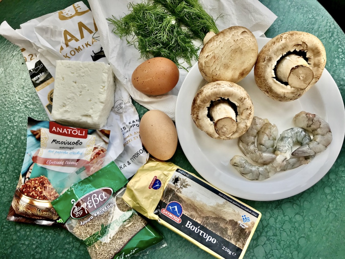 Masa jajeczna: Wbij jajka do miski. Dodaj do nich trochę pokruszonej fety oraz posiekaną nać anyżu lub koperku. Dopraw solą, suszonymi płatkami chilli, suszonym anyżem i świeżo zmielonym pieprzem. Całość dobrze wymieszaj, aby uzyskać gładką masę. Odstaw na bok.