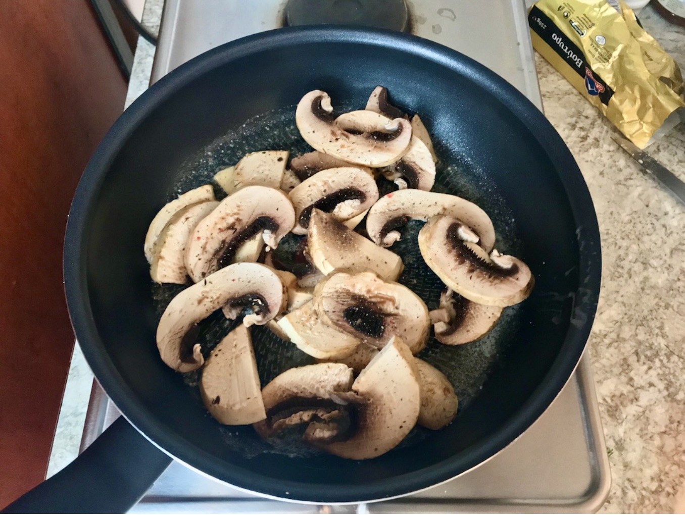 Smażenie pieczarek: Pokrój pieczarki najlepiej w plastry, aby dobrze się zrumieniły. Na patelnię włóż porządną łyżkę masła i jeszcze zanim się całkiem roztopi, wrzuć pieczarki. Posyp je solą i odrobiną pieprzu. Smaż na dużym ogniu przez 2 minuty, aż się zrumienią.