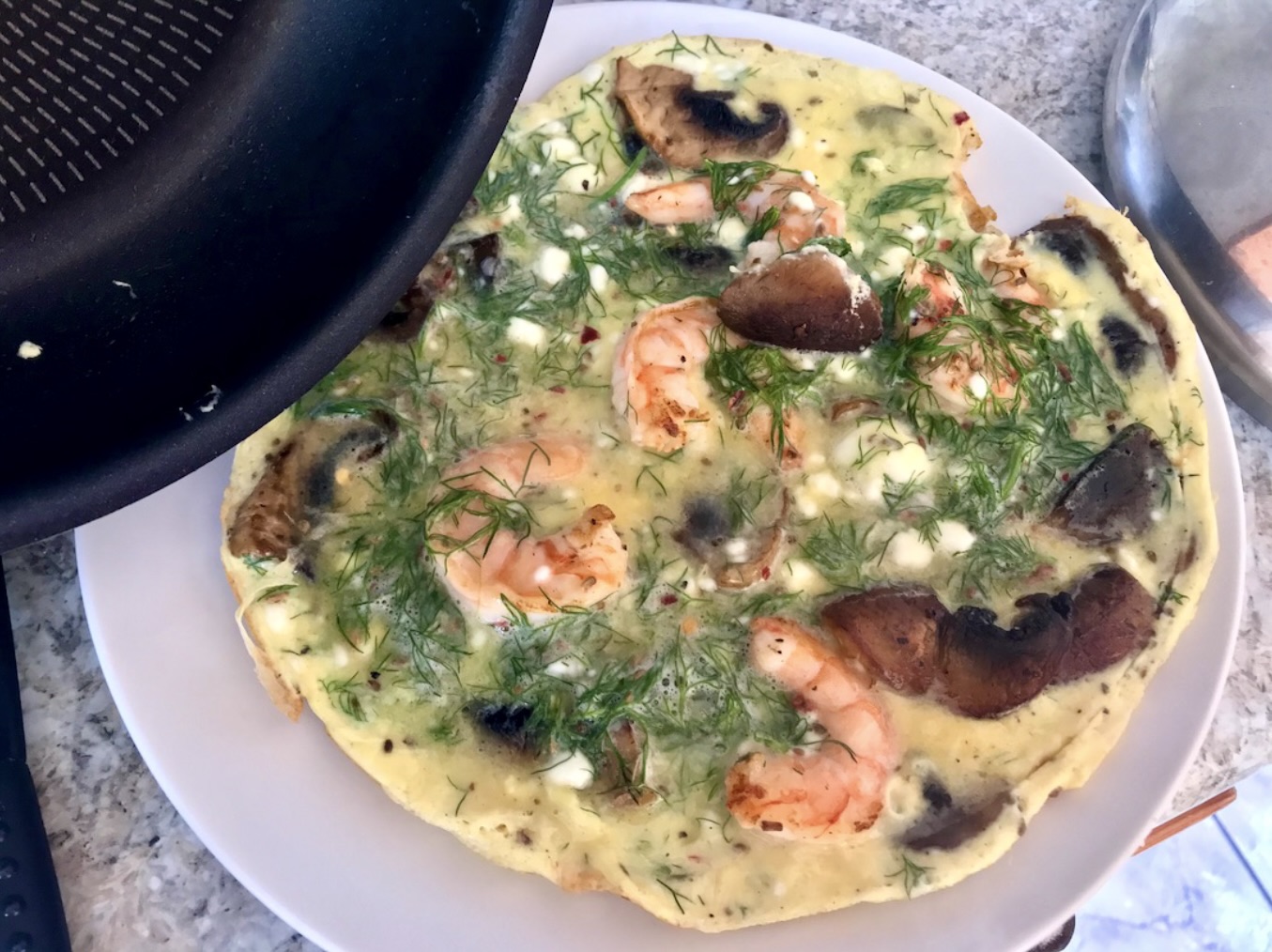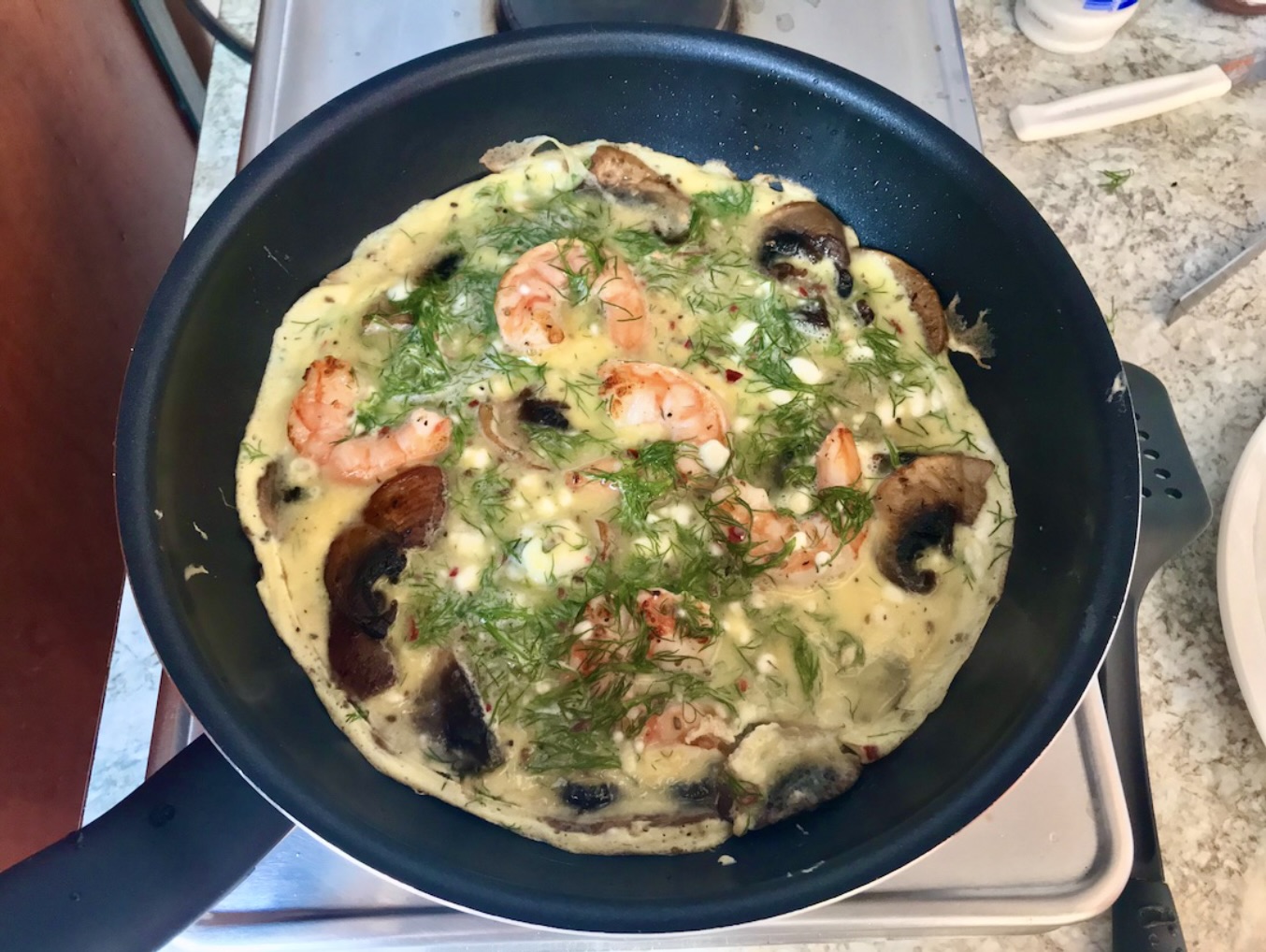 Omlet z krewetkami, pieczarkami i serem