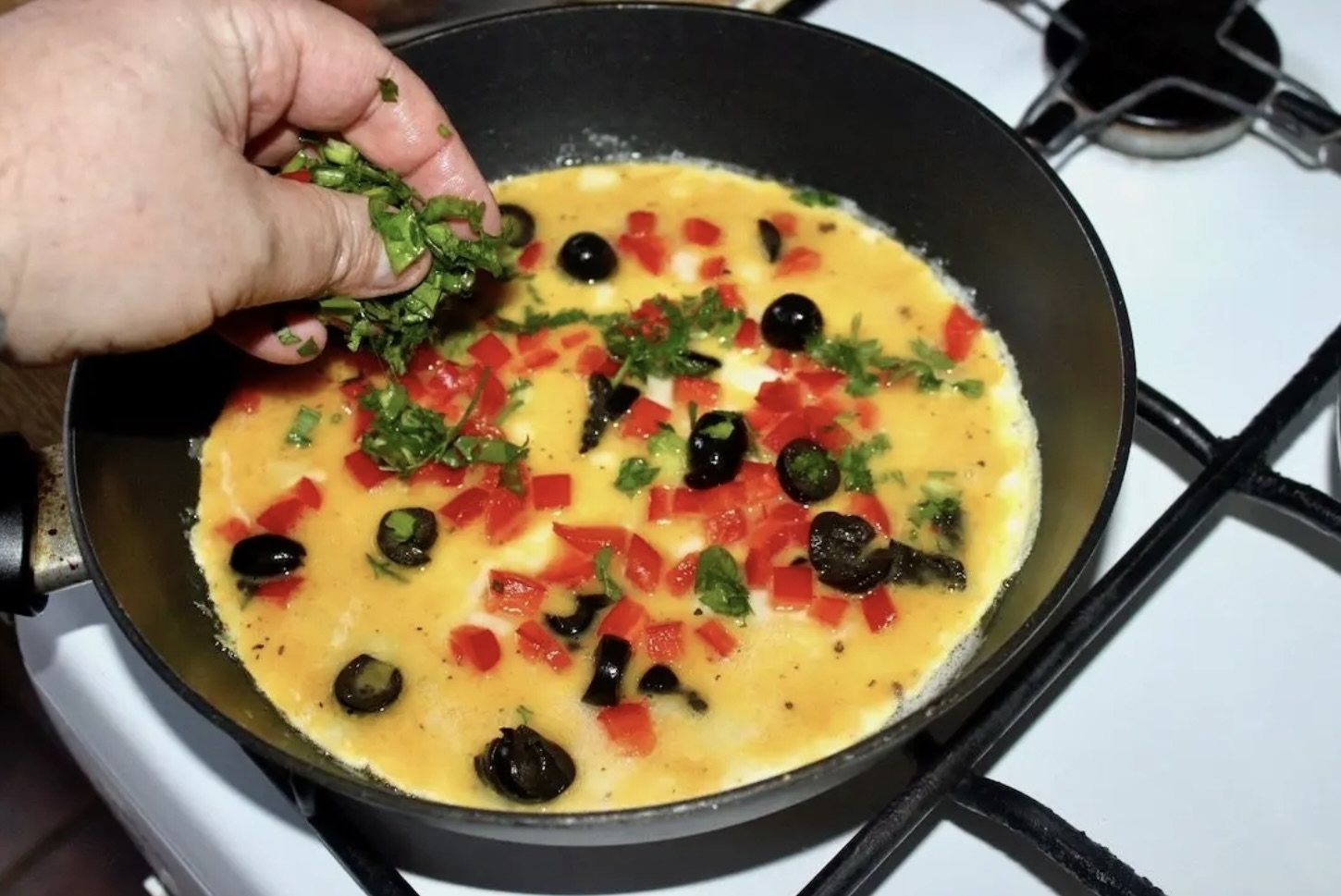 Zmniejsz od razu do minimum gaz pod patelnią i niezwłocznie wrzuć paprykę, oliwki i natkę pietruszki.