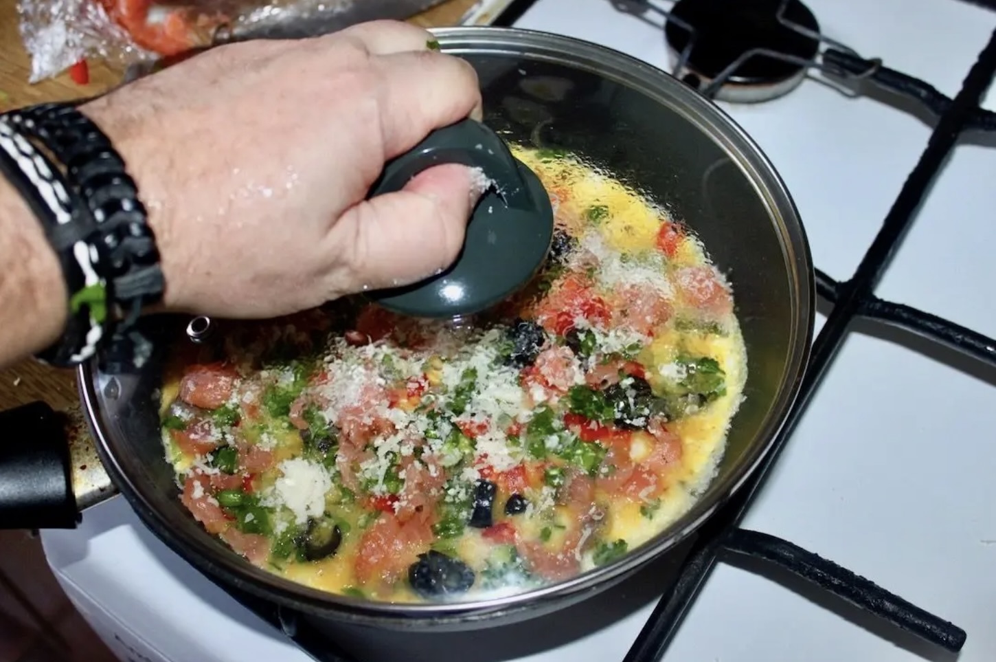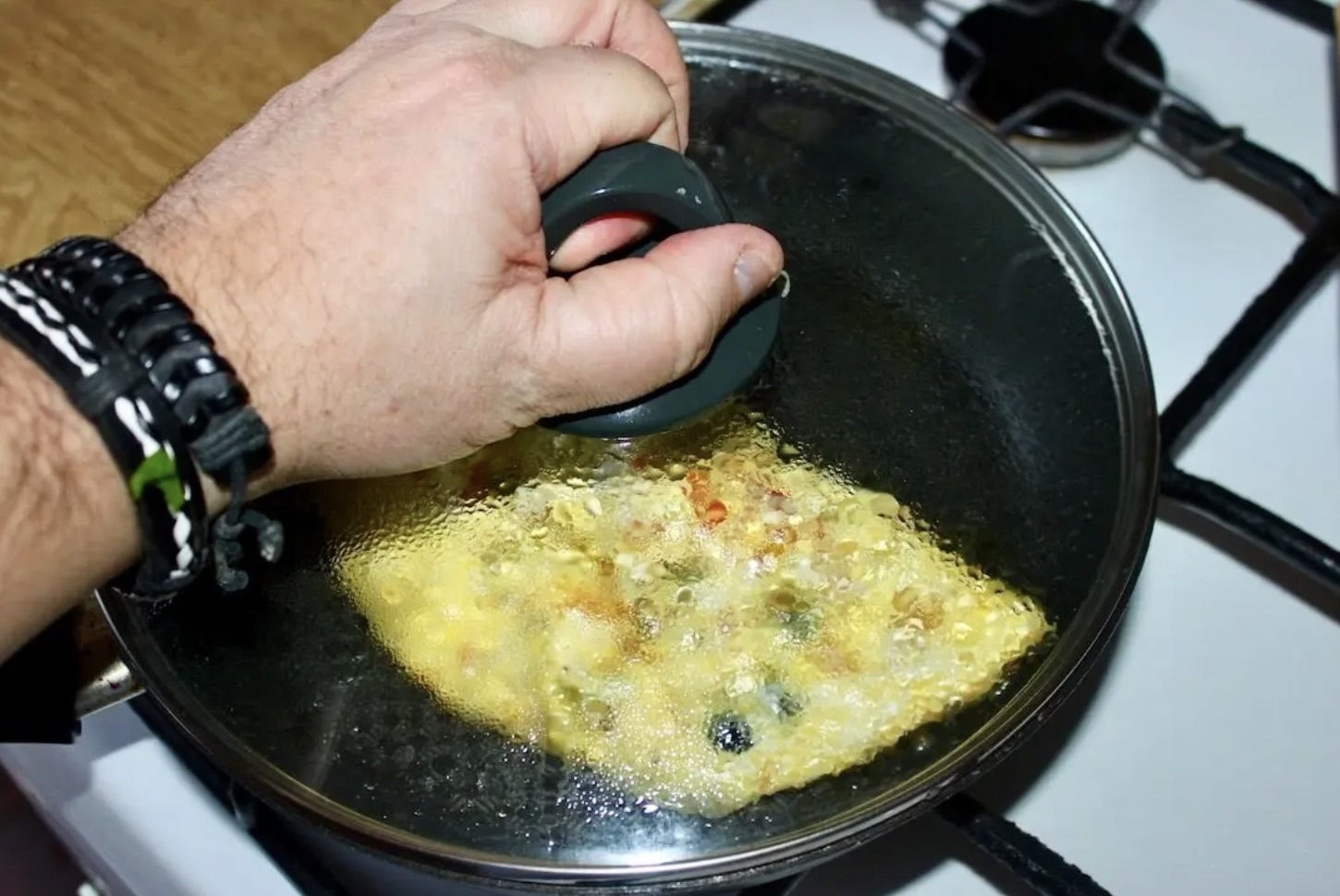 Przykryj patelnię pokrywką i smaż omleta 2 minuty na wolnym ogniu, aby jajka lekko się ścięły.