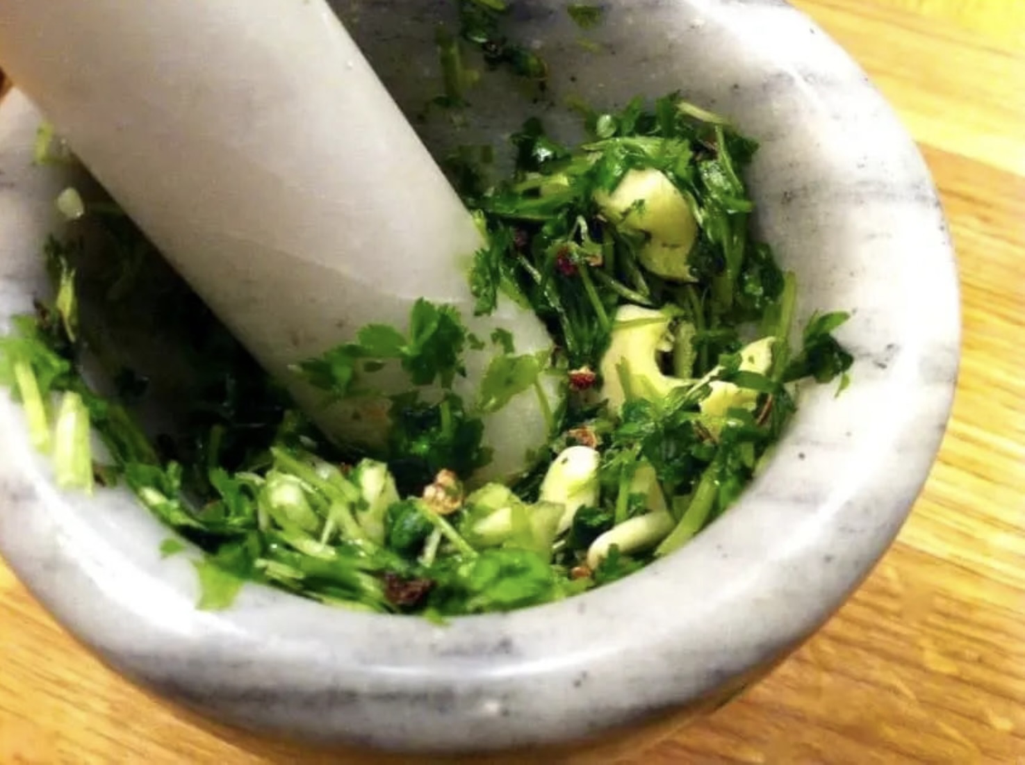 Do moździerza wrzuć obrany czosnek, ziarna pieprzu, a także kolendrę. Ucieraj wszystko dokładnie, aby uzyskać aromatyczną pastę.