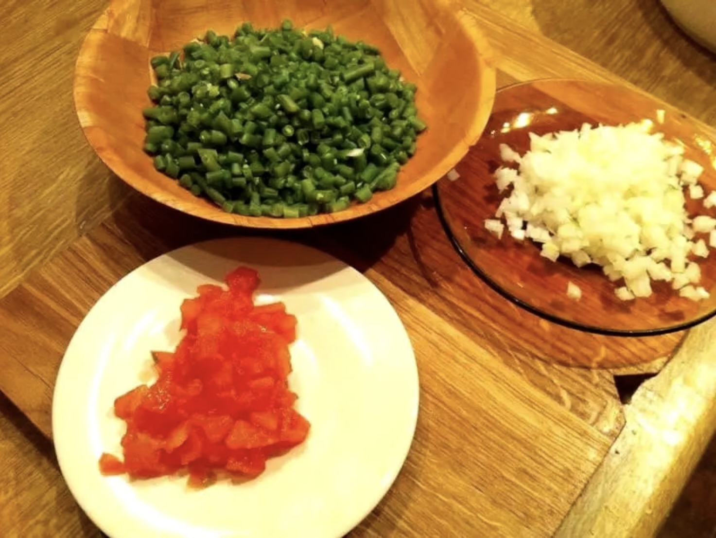 Fasolkę szparagową umyj, odetnij końcówki. Wrzuć na osolony wrzątek i gotuj kilka minut, aby była „al dente”. Odcedź, ostudź i pokrój w drobną kosteczkę.