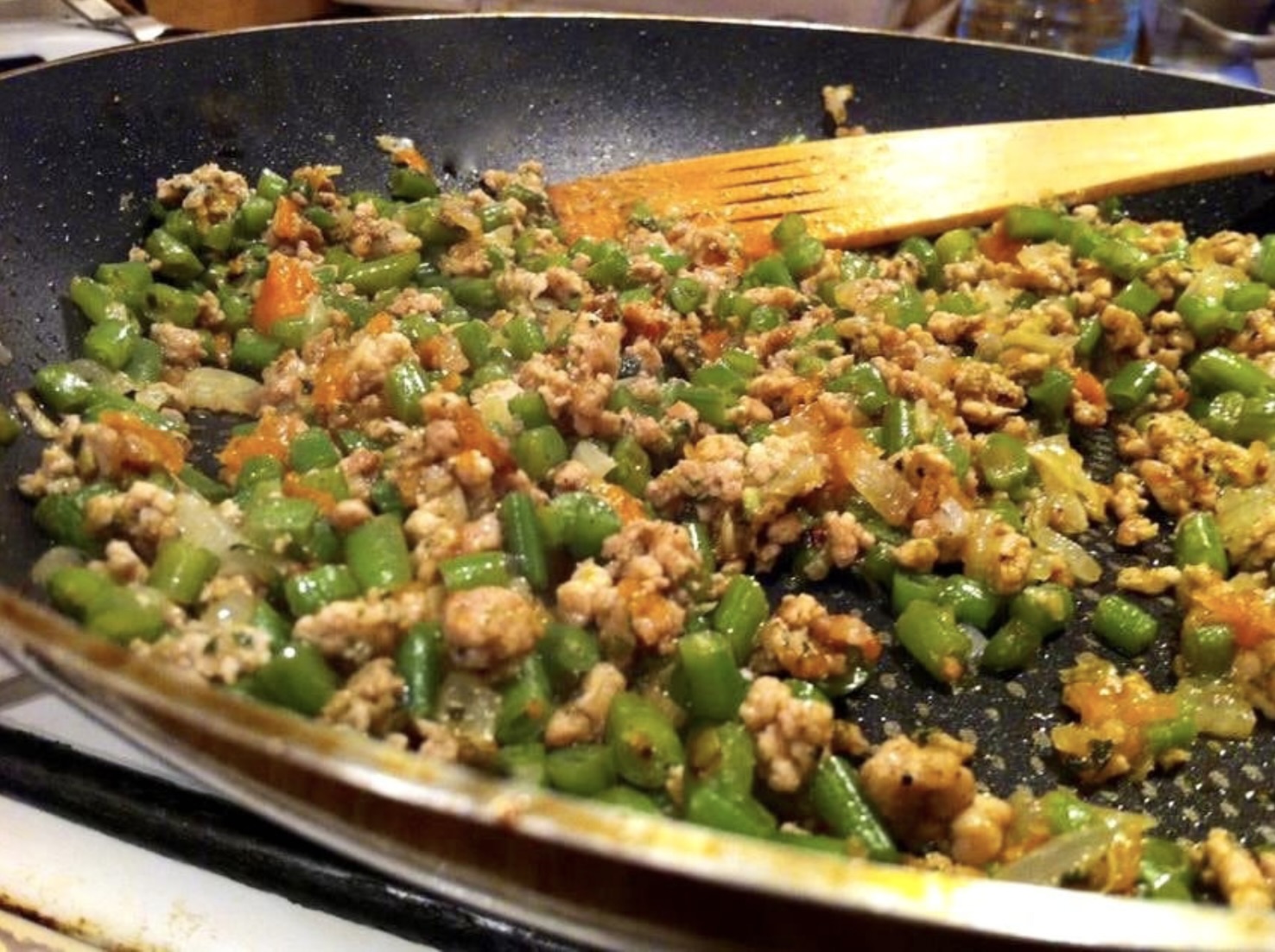 Następnie dodaj mielone mięso i smaż wszystko przez kolejne 3 minuty.