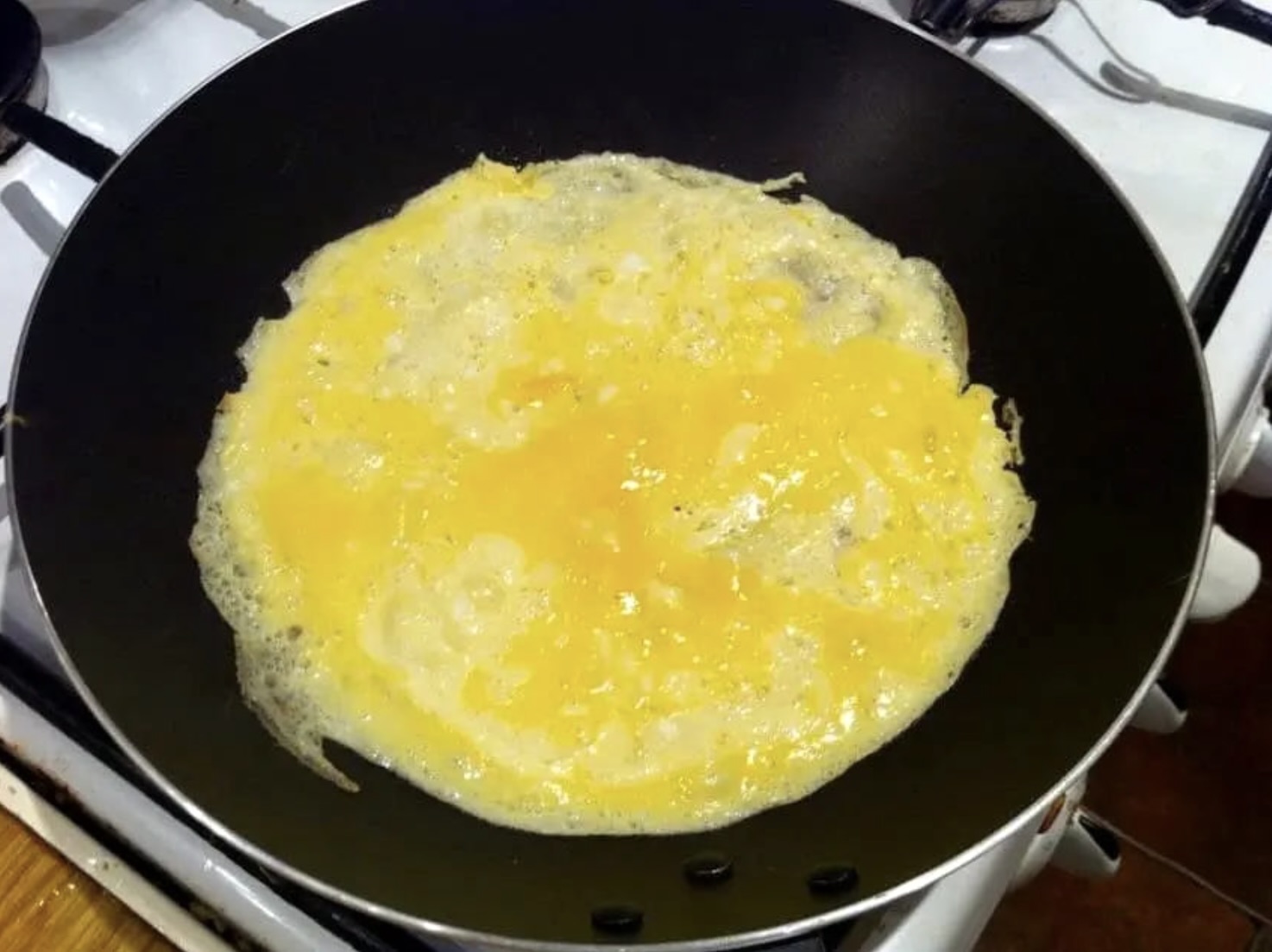 Smaż na oleju arachidowym cieniutkie omlety (powinno wyjść 6 sztuk).