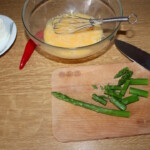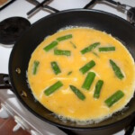 Smażenie omletu: Rozgrzej małą patelnię (ok. 20 cm) i wrzuć na nią łyżeczkę masła. Zanim masło się całkiem rozpuści, wlej masę jajeczną ze szparagami. Smaż na małym ogniu.