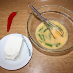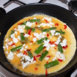 Podanie: Gdy omlet zacznie się ścinać, rozłóż na nim pokruszony ser, chilli i jalapeno. Smaż tak długo, jak lubisz – autor proponuje, aby omlet był w środku średnio ścięty, a ser dobrze roztopiony.