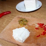 Dodawanie sera i papryczek: W międzyczasie pokrusz fetę/bryndzę, posiekaj drobno papryczkę chilli i pokrój jalapeno.