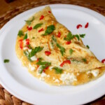 Wykończenie: Złóż omlet na pół. Możesz na chwilę przykryć patelnię pokrywką, jeśli wolisz bardziej ścięty omlet. Wyłóż na talerz, posyp natką pietruszki i dodatkową posiekaną papryczką chilli.
