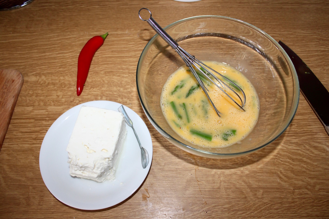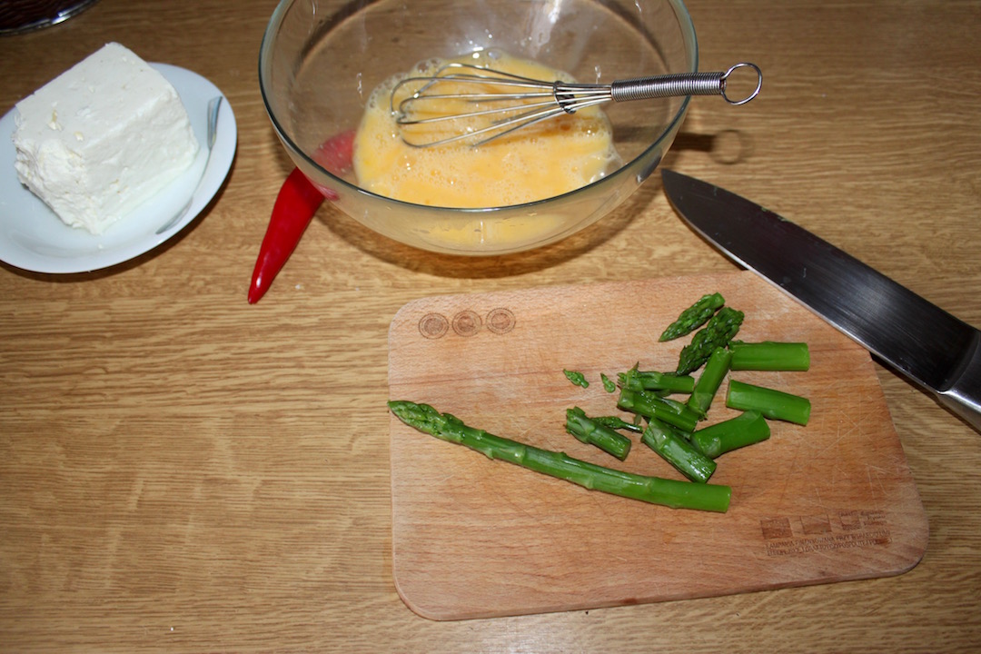 Przygotowanie masy jajecznej: Jajka wbij do dużej miski i dokładnie rozkłóć, aby wtłoczyć jak najwięcej powietrza. Dodaj pokrojone szparagi i delikatnie wymieszaj. Możesz lekko posolić, pamiętając, że ser (feta/bryndza) jest zwykle dość słony.