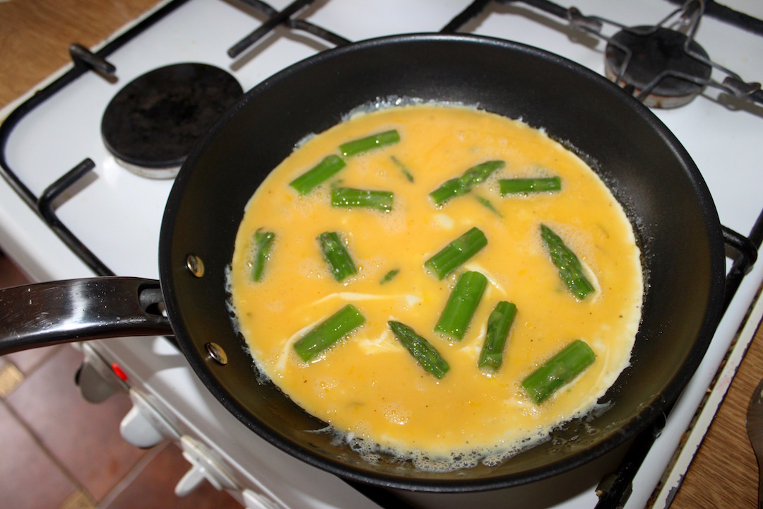 Smażenie omletu: Rozgrzej małą patelnię (ok. 20 cm) i wrzuć na nią łyżeczkę masła. Zanim masło się całkiem rozpuści, wlej masę jajeczną ze szparagami. Smaż na małym ogniu.