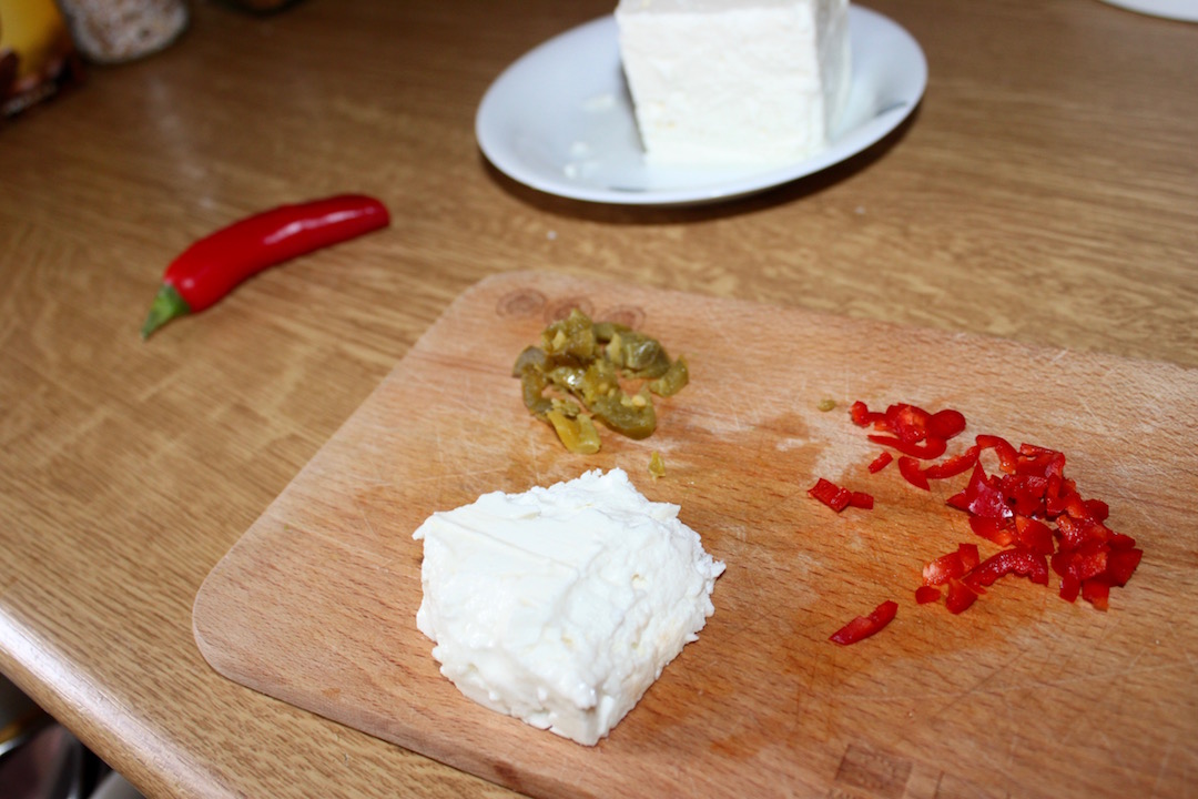 Dodawanie sera i papryczek: W międzyczasie pokrusz fetę/bryndzę, posiekaj drobno papryczkę chilli i pokrój jalapeno.