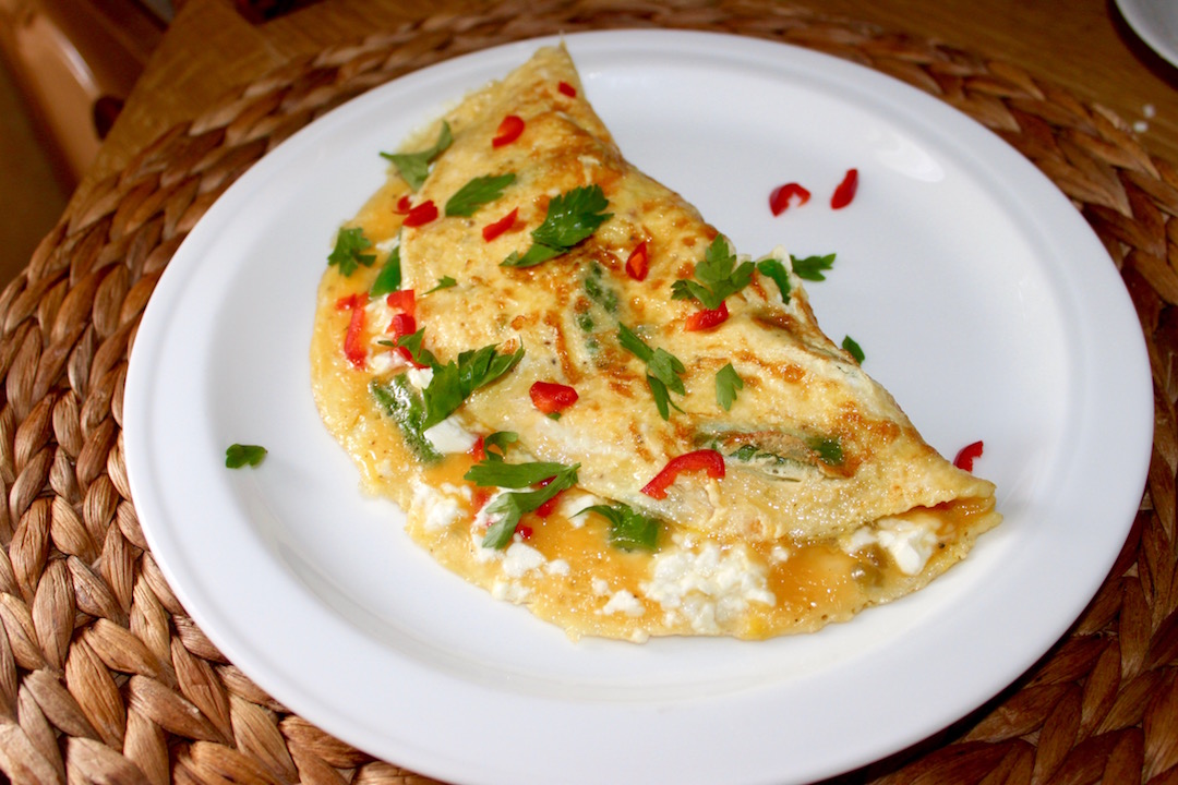 Wykończenie: Złóż omlet na pół. Możesz na chwilę przykryć patelnię pokrywką, jeśli wolisz bardziej ścięty omlet. Wyłóż na talerz, posyp natką pietruszki i dodatkową posiekaną papryczką chilli.