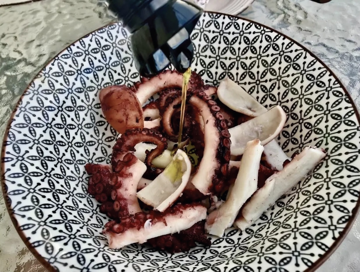 Zakup ośmiornicy: Można użyć mrożonej, która podobno ma bardziej kruche mięso po rozmrożeniu.