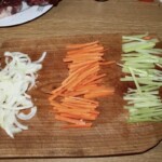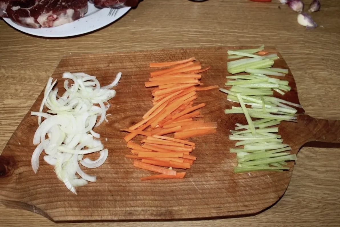 Cebulę obierz i pokrój w piórka. Marchewkę i seler naciowy pokrój w julienne (cienkie słupki).