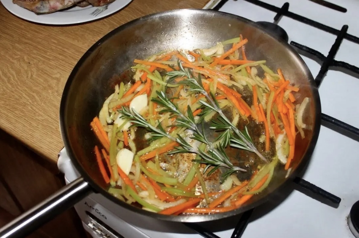 Na patelnię (nieoczyszczoną po smażeniu mięsa) wrzuć pokrojone warzywa. Smaż na wolnym ogniu przez około 5-7 minut, aż zmiękną.
