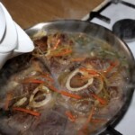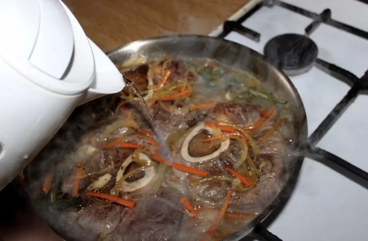 Włóż z powrotem na patelnię przesmażone mięso. Wlej około szklanki gorącej wody – mniej więcej tyle, aby sięgała do połowy grubości mięsa.