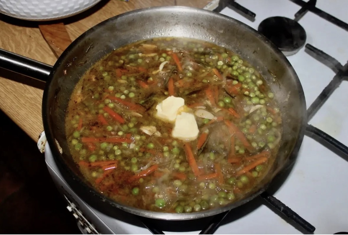 Uwaga: Oryginalny przepis sugeruje dodanie dużego, startego pomidora w sezonie, ale w tym wariancie zastąpiono go groszkiem.