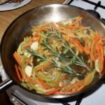 Dodaj gałązki rozmarynu oraz obrane ząbki czosnku. Smaż przez 1-2 minuty.