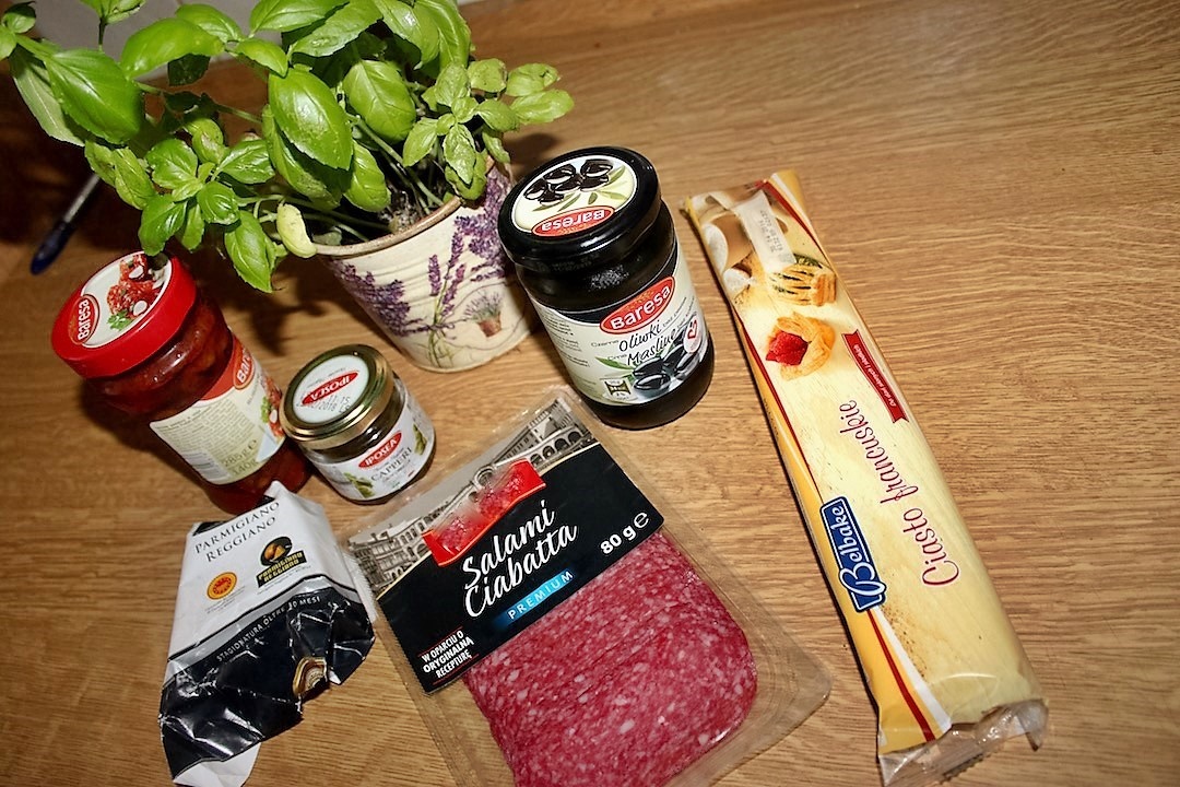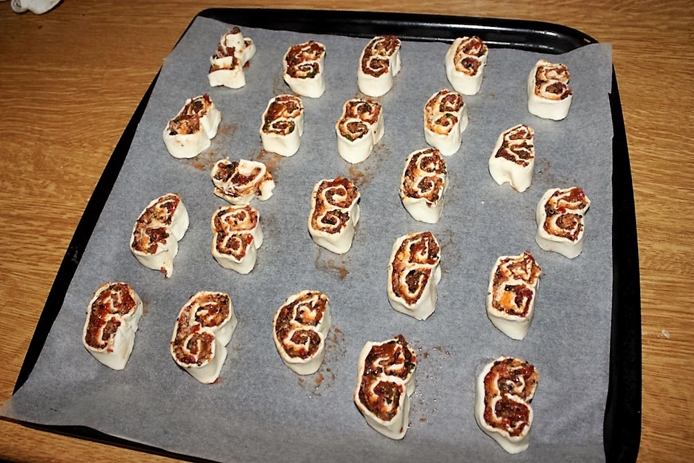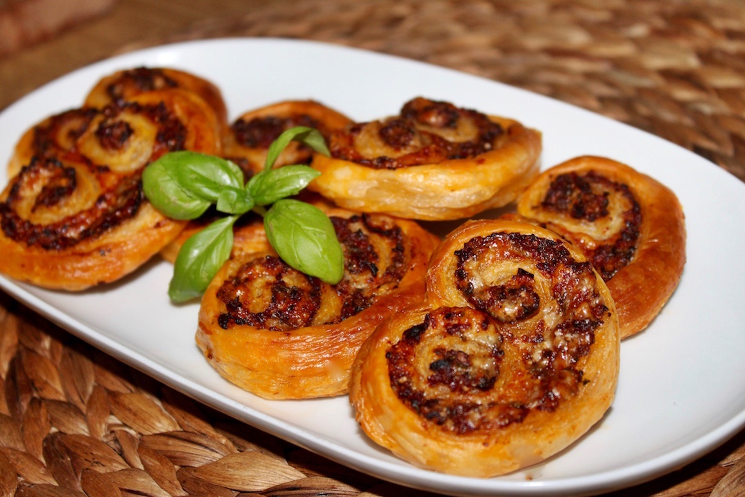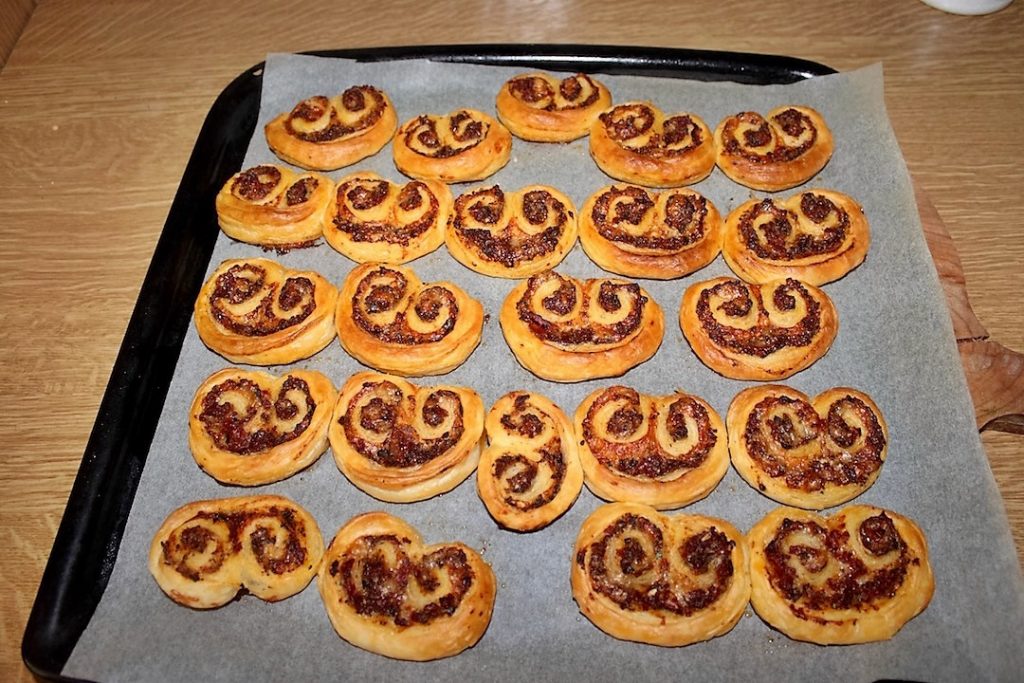 Palmiery to prawdziwie błyskawiczna przekąska z ciasta francuskiego. Same palmiery to rodzaj ciasteczek, które zwykle robi się na słodko, najczęściej z cynamonem. Ciasto francuskie lubi się jednak chyba ze wszystkimi składnikami, więc palmiery na słono smakują również znakomicie. O wielu daniach mówi się, że są błyskawiczne i z reguły tak jest. Palmiery robi się jednak jeszcze szybciej. Smak moich palmierów kręci się wokół basenu Morza Śródziemnego, bowiem stanowi połączenie salami, oliwek i paru innych składników. To jednak taki rodzaj przekąski, że palmiery wyjdą znakomicie z różnymi składnikami. Pamiętaj tylko, aby mieć zawsze w lodówce ciasto francuskie. Resztę zdziałają dodatki, które akurat masz w lodówce. Na początek jednak zrób proszę palmiery na słono według poniższego przepisu.