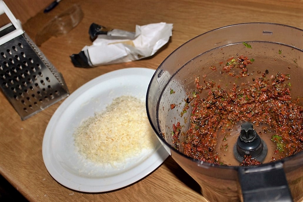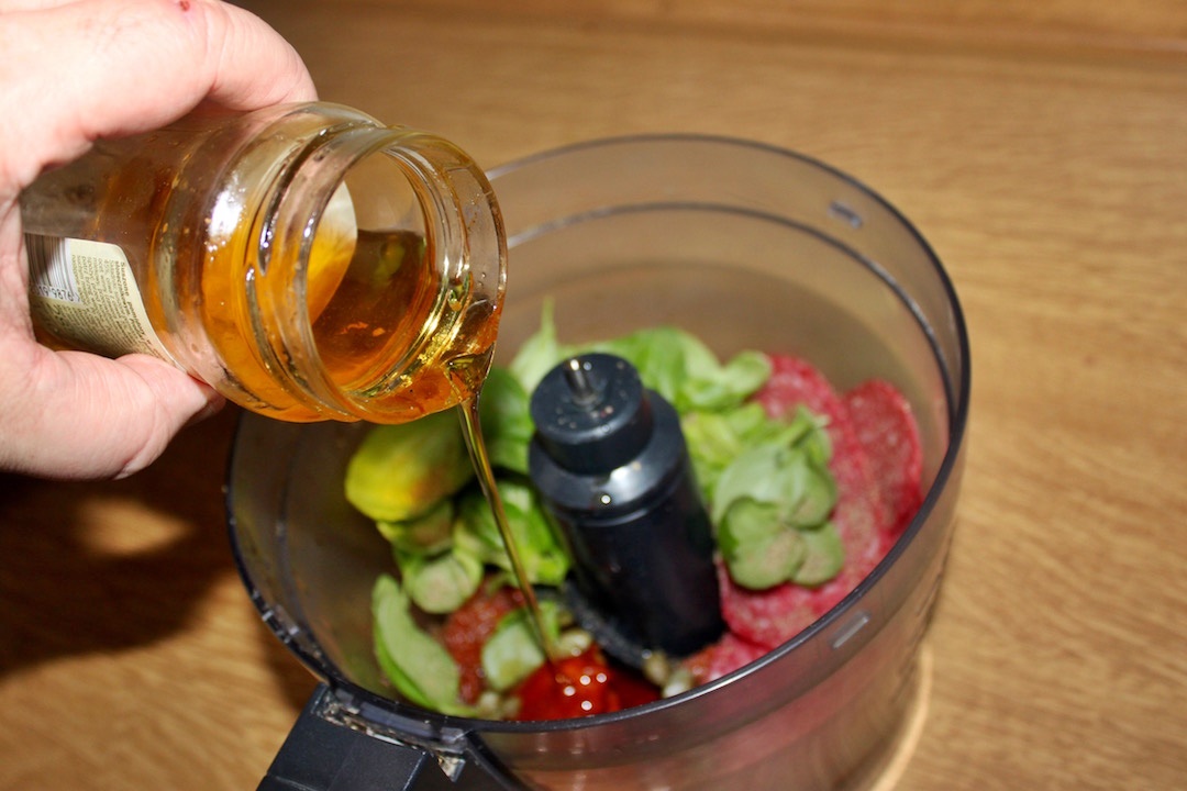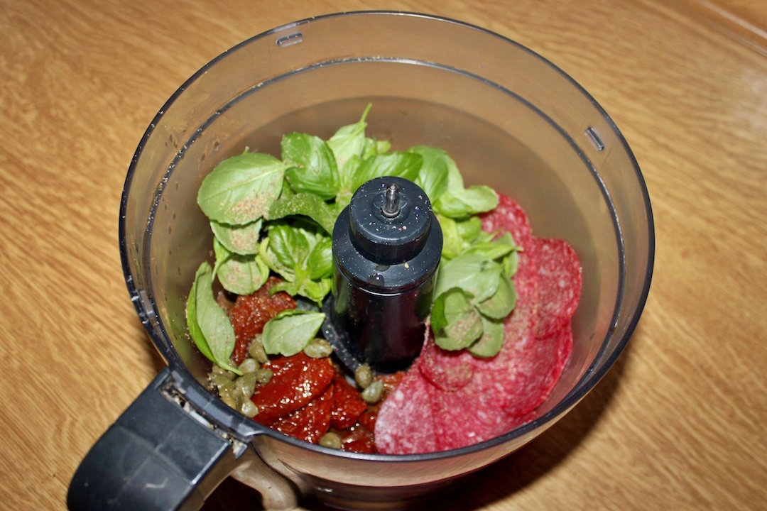 Farsz: W malakserze umieść salami, kapary, suszone pomidory, oliwki oraz liście bazylii. Dodaj około 2 łyżki oliwy z pomidorów, aby pasta łatwiej się rozsmarowywała. Całość zmiksuj na gładką masę i dopraw pieprzem.