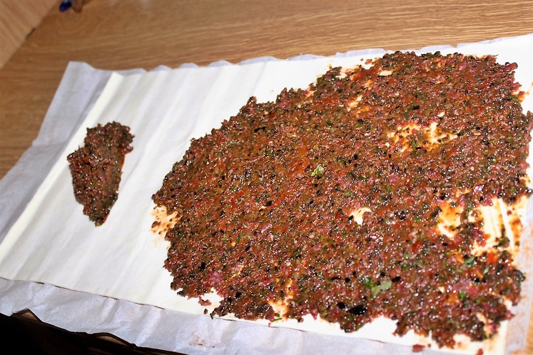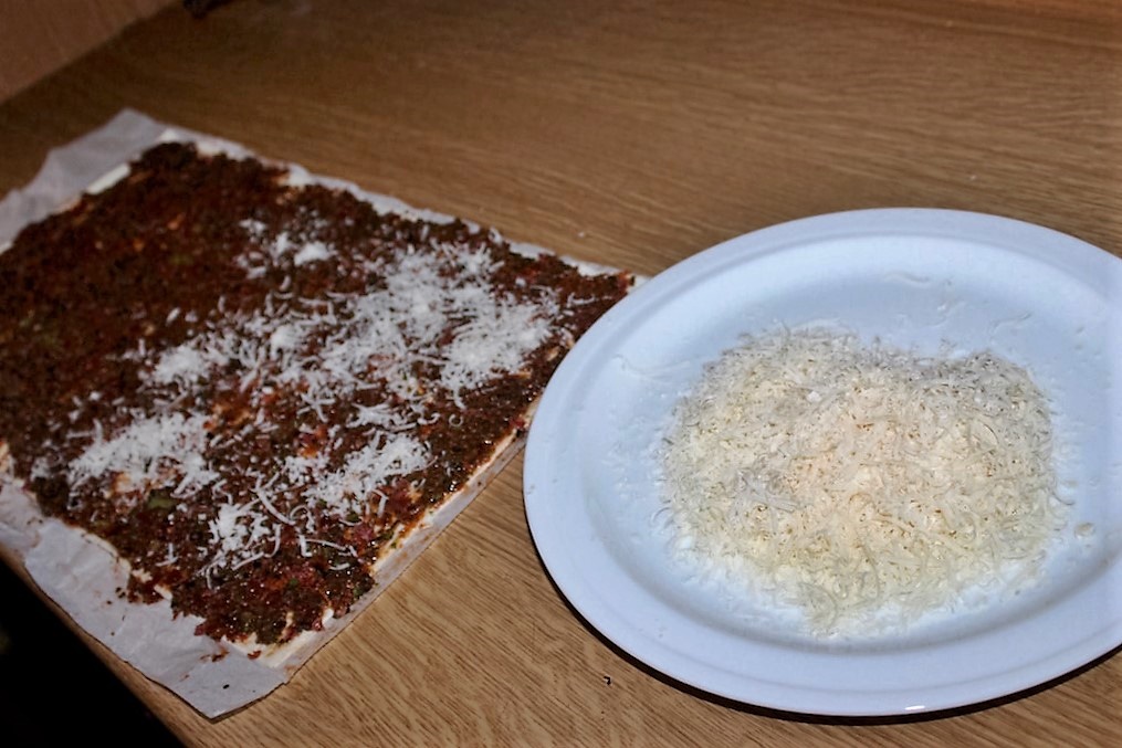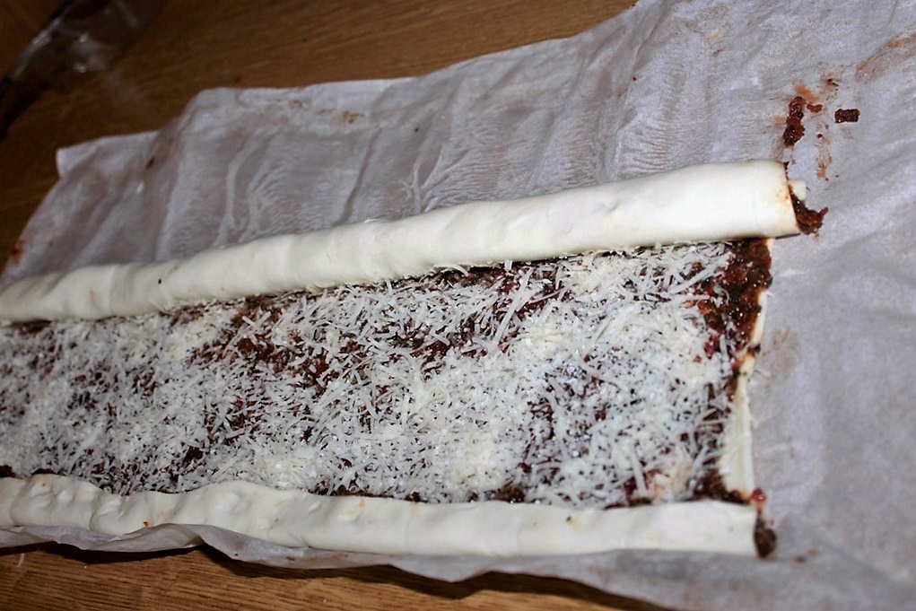 Smarowanie: Rozłóż zimne ciasto francuskie. Rozsmaruj na nim równomiernie przygotowaną pastę, a następnie posyp całość startym serem.