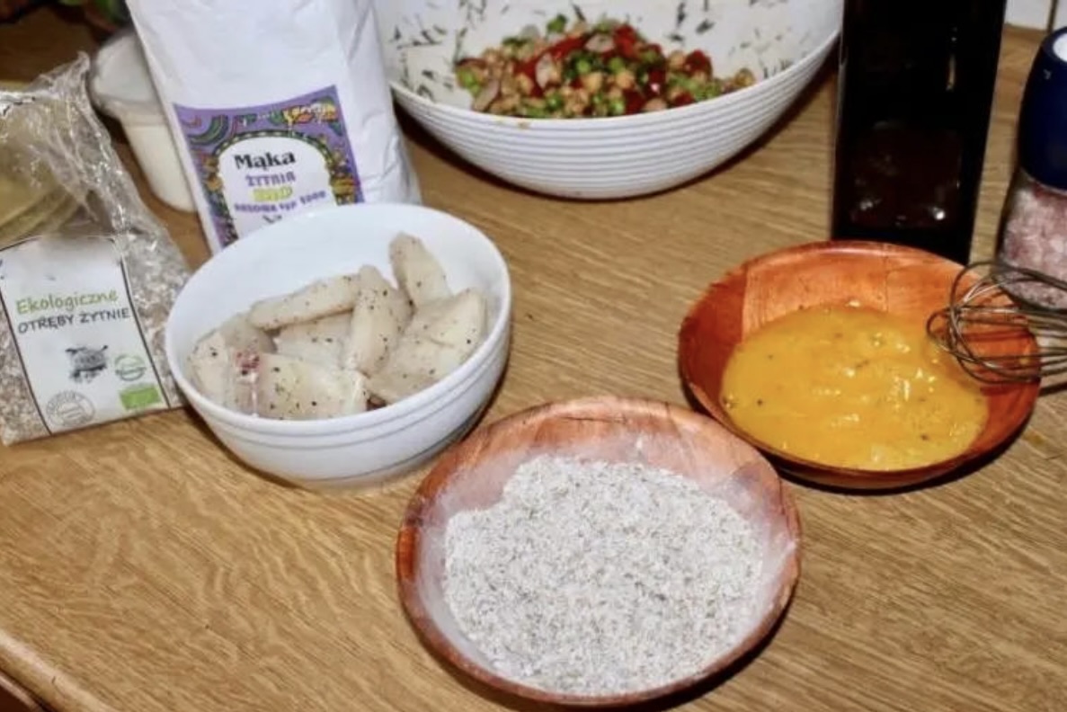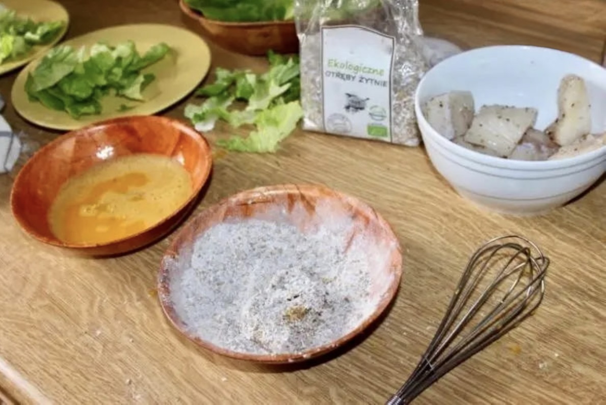 Ważne: Zrób to bezpośrednio przed włożeniem ryby na patelnię, ponieważ mąka żytnia gęstnieje w jajku bardzo szybko.
