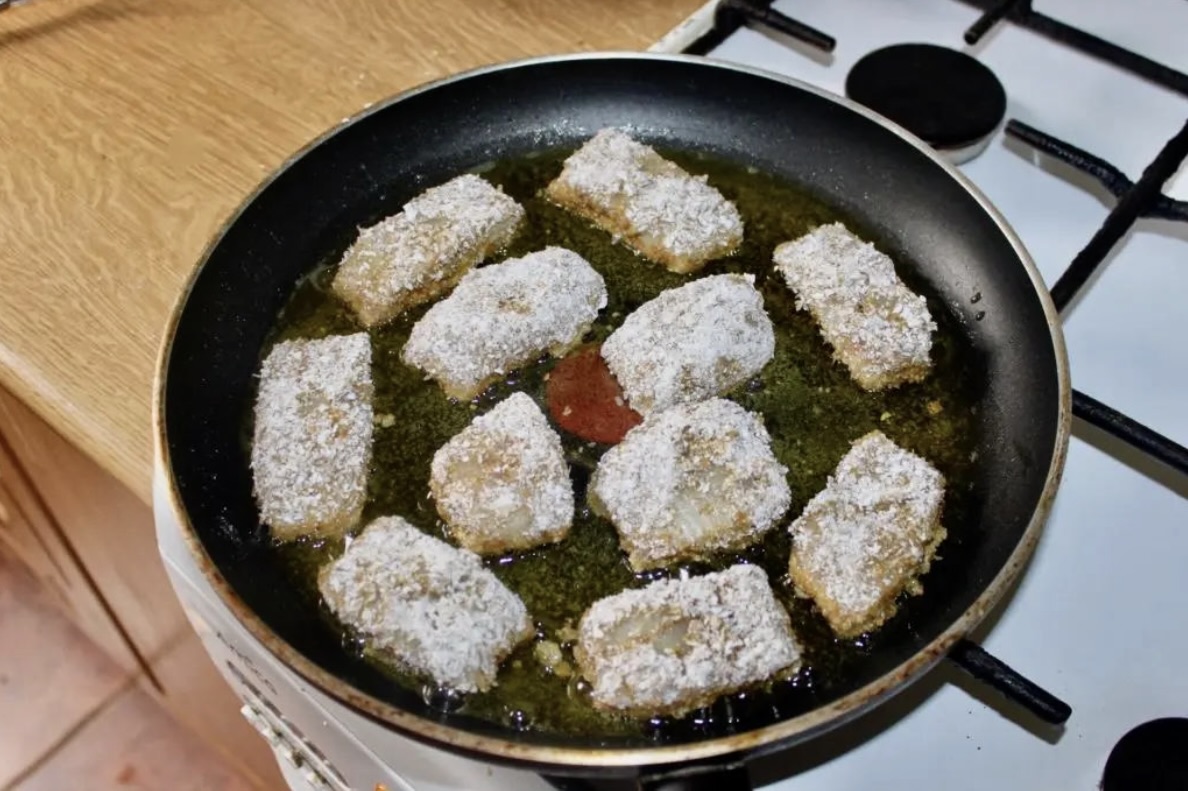 Układaj obtoczone w cieście paluszki na patelni z rozgrzanym do średniej temperatury olejem roślinnym lub oliwą.