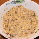 Mieszanie: Do dużej miski włóż posiekane mięso z kurczaka, ugotowaną kaszę jaglaną i przesmażoną cebulę. Dopraw solą, świeżo mielonym pieprzem i dodaj garść posiekanego szczypiorku, dymki lub natki pietruszki (albo wszystkich po trochu). Farsz bardzo dokładnie wymieszaj, będzie kleisty dzięki kaszy jaglanej. Przykryj miskę folią spożywczą i odstaw na bok.