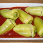 Umyj i osusz podłużne, nieduże słodkie papryki. Odetnij z każdej „czapeczkę” i zachowaj ją.