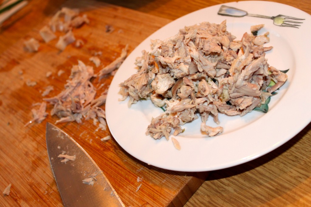 Kurczak: Drobno posiekaj ugotowane mięso z kurczaka (np. z rosołu).