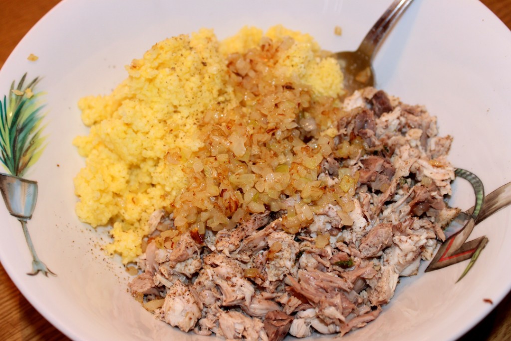 Mieszanie: Do dużej miski włóż posiekane mięso z kurczaka, ugotowaną kaszę jaglaną i przesmażoną cebulę. Dopraw solą, świeżo mielonym pieprzem i dodaj garść posiekanego szczypiorku, dymki lub natki pietruszki (albo wszystkich po trochu). Farsz bardzo dokładnie wymieszaj, będzie kleisty dzięki kaszy jaglanej. Przykryj miskę folią spożywczą i odstaw na bok.