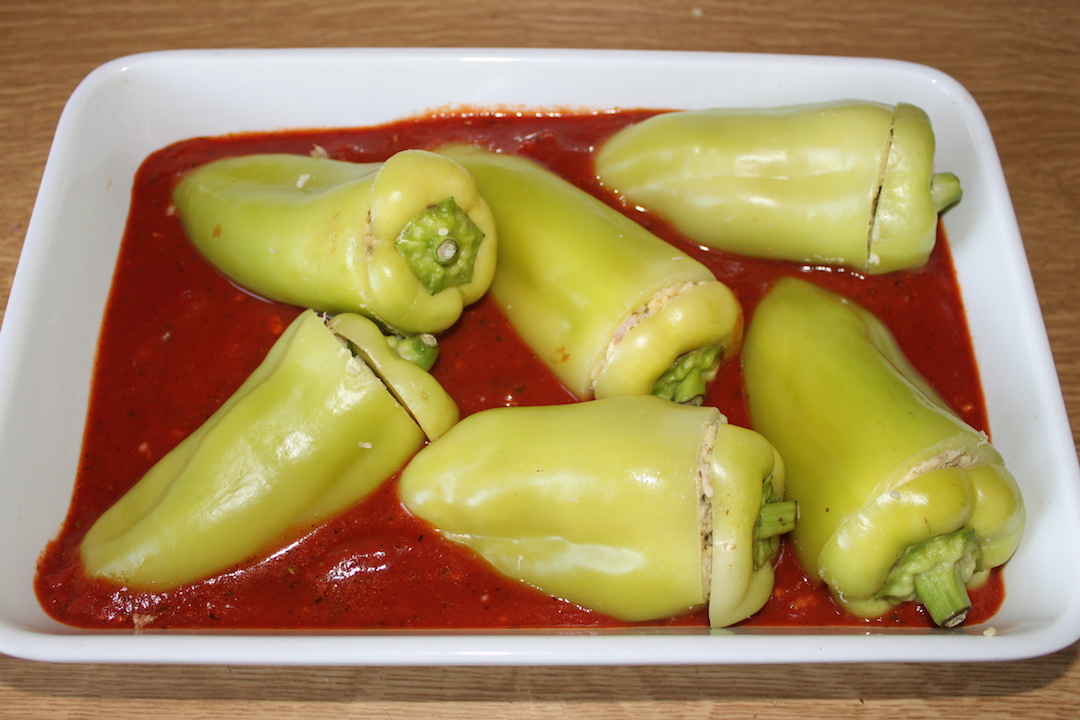 Ułóż papryki na boku w naczyniu żaroodpornym z sosem pomidorowym.